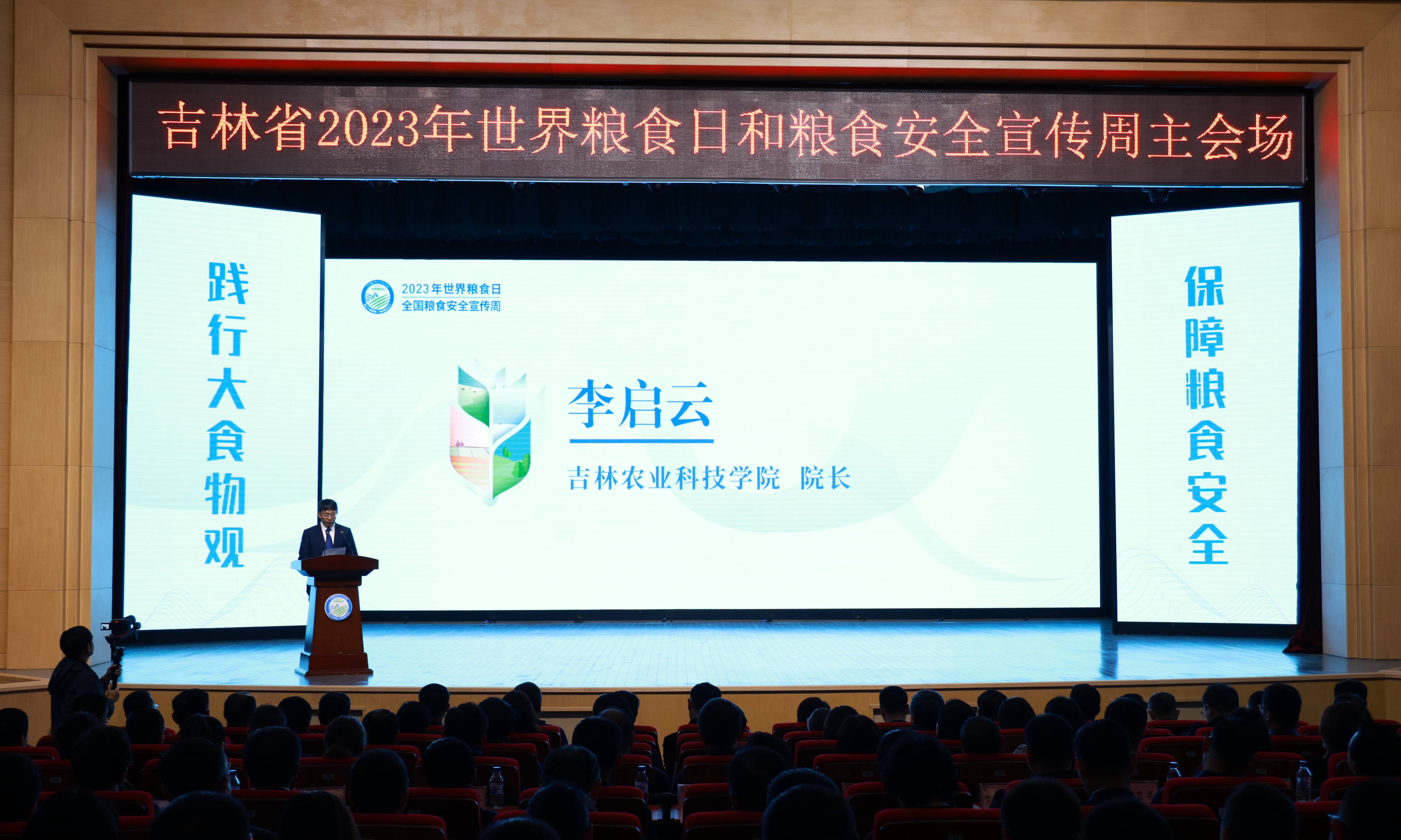 10月16日,吉林省2023年世界粮食日和粮食安全宣传周主会场活动在我校举办。省粮食和物资储备局党组成员、副局长田涛,省农业农村厅总经济师邵岩,省教育厅二级巡视员举树明及学校领导毛彦军、李启云、金华、白雪、李国江、潘力、尹柏双出席会议。省科学技术厅、省妇女联合会,吉林市粮食和物资储备局、农业农村局、教育局、科学技术局、妇女联合会领导和全校各学院师生代表共同参加活动。省粮食和物资储备局产业发展处处长何伟主持仪式。