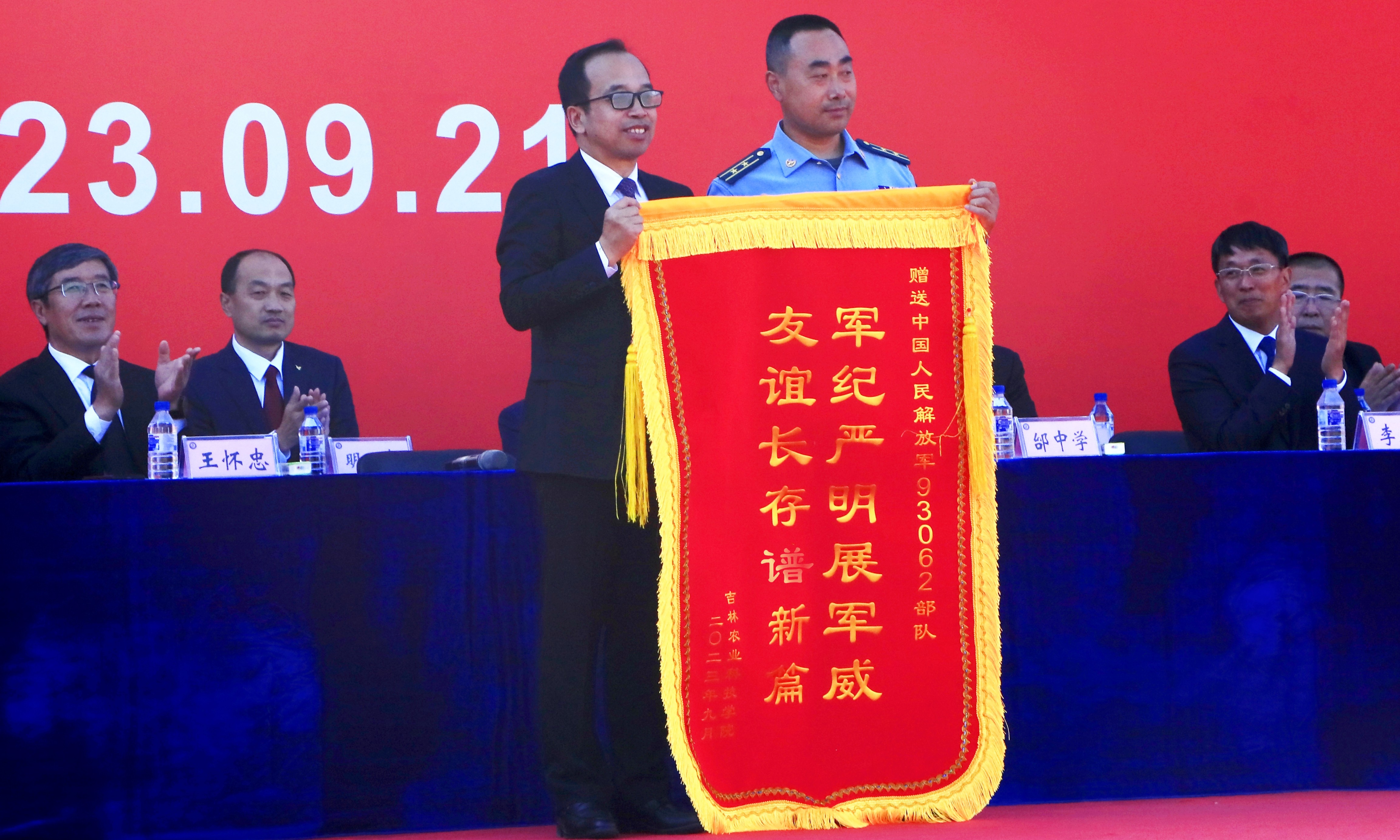 党委书记毛彦军向93062承训部队赠送锦旗,向部队多年来对学校军训工作的大力支持表示诚挚的敬意。