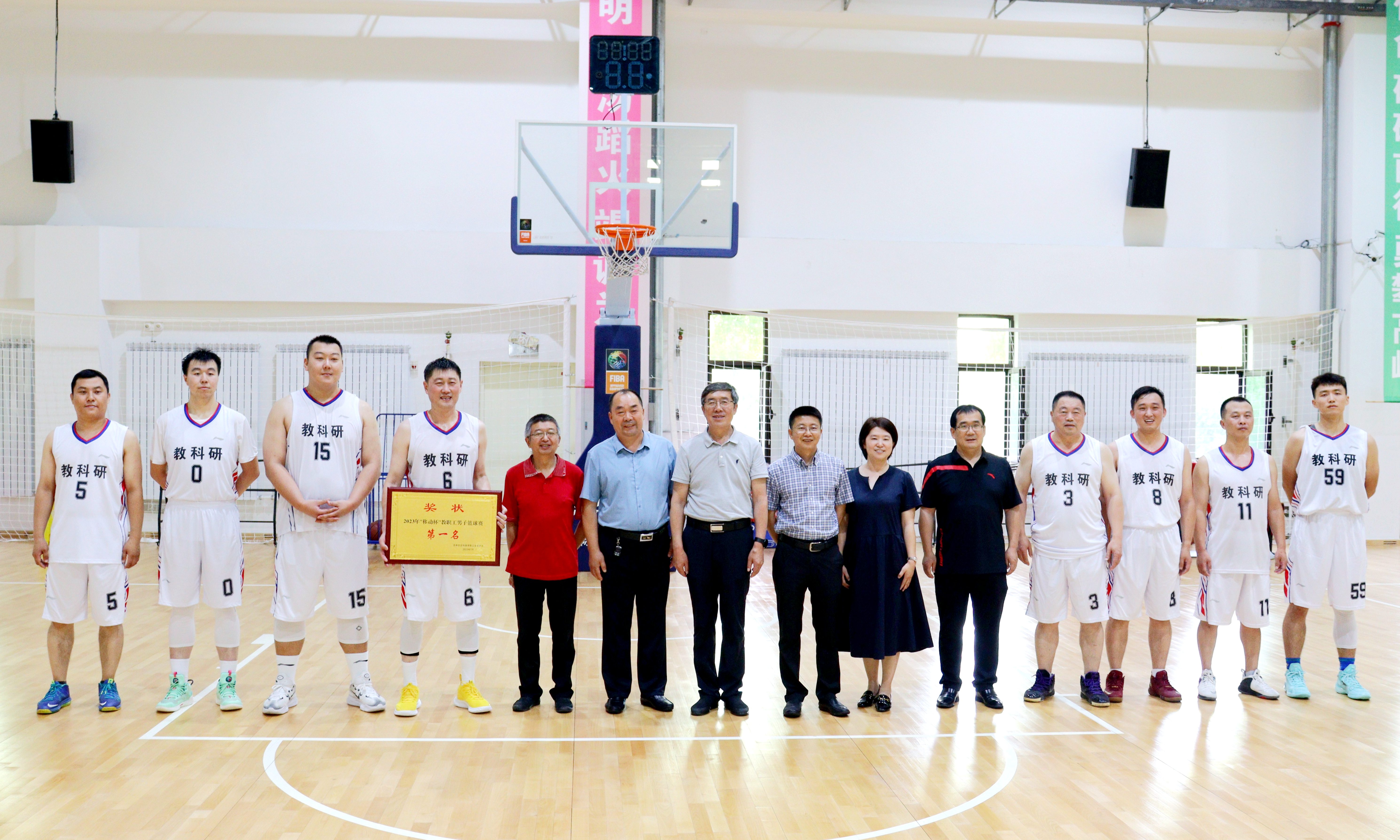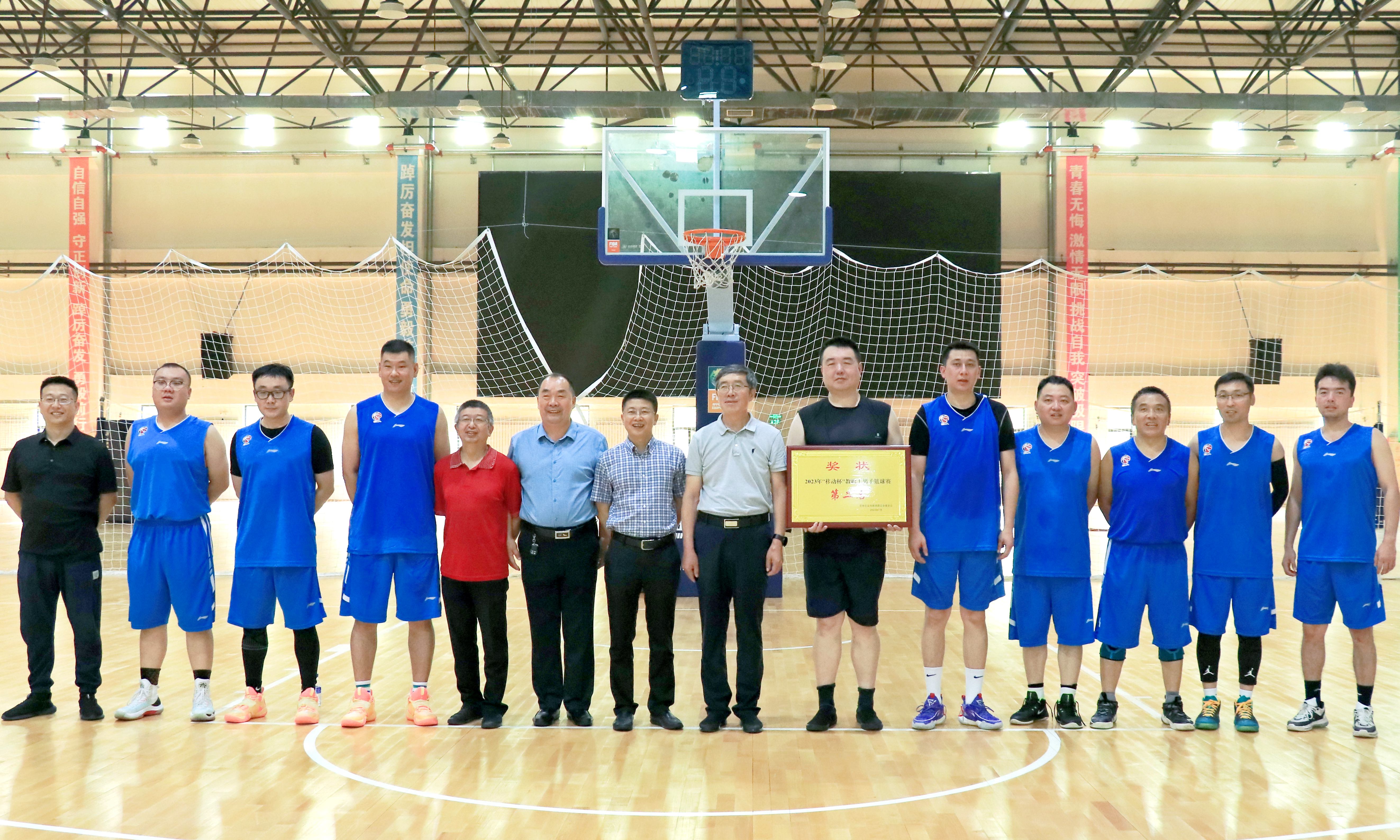 由校工会主办,体育教学部协办的2023年“移动杯”教职工男子篮球赛历时9天,经过小组赛和淘汰赛的激烈争夺,于7月11日在九站校区体育馆落下帷幕。本次篮球赛以庆祝建党102周年为主线,以增强教职工身体素质、提高健康水平、加强学校精神文明建设为目标,得到了全校16个分工会的大力支持,共有13支队伍参赛。