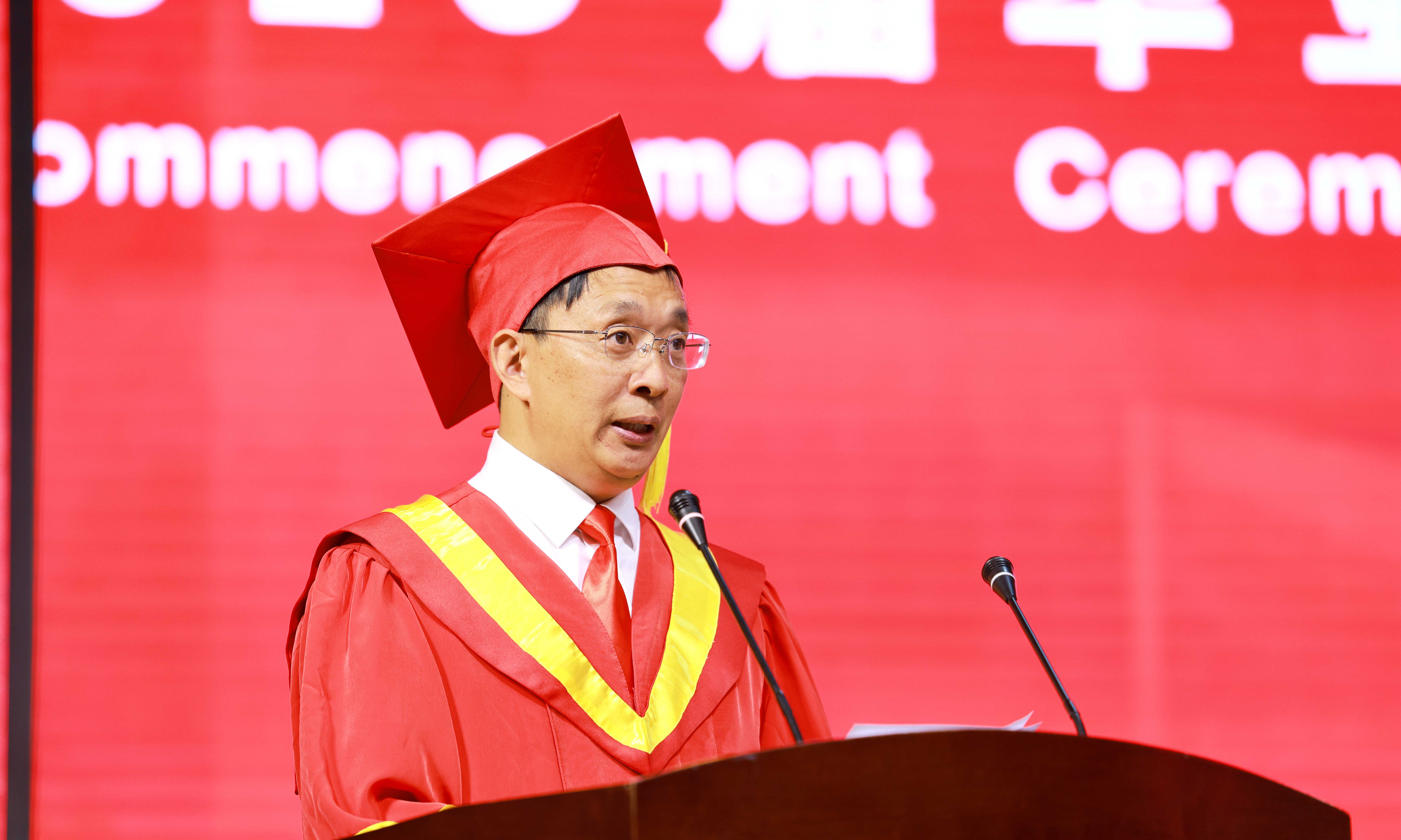 校长李启云代表全体师生向经历疫情严峻考验并顺利完成学业的全体毕业生表示诚挚的祝贺,向全体老师和教职员工辛勤的培育和付出致以由衷的感谢。