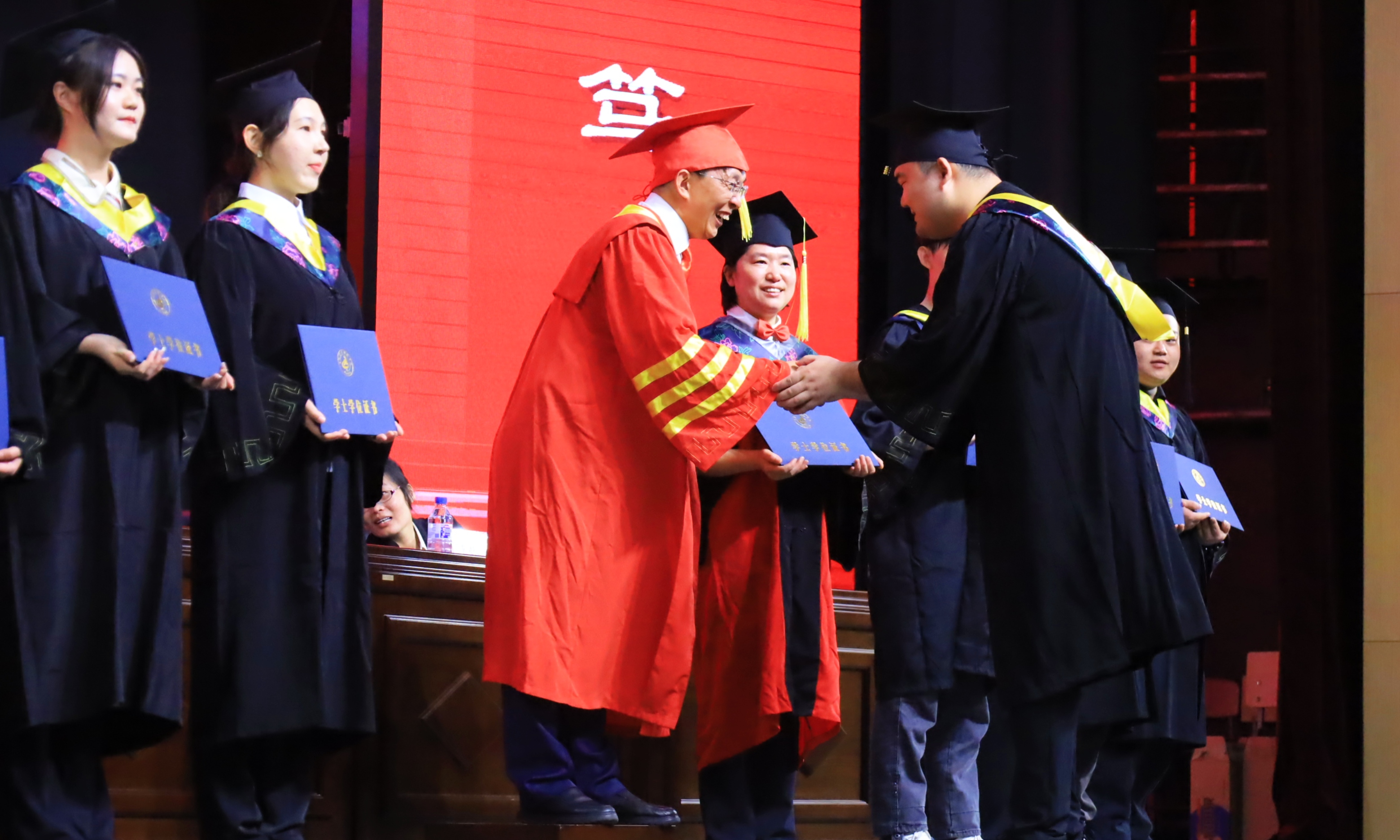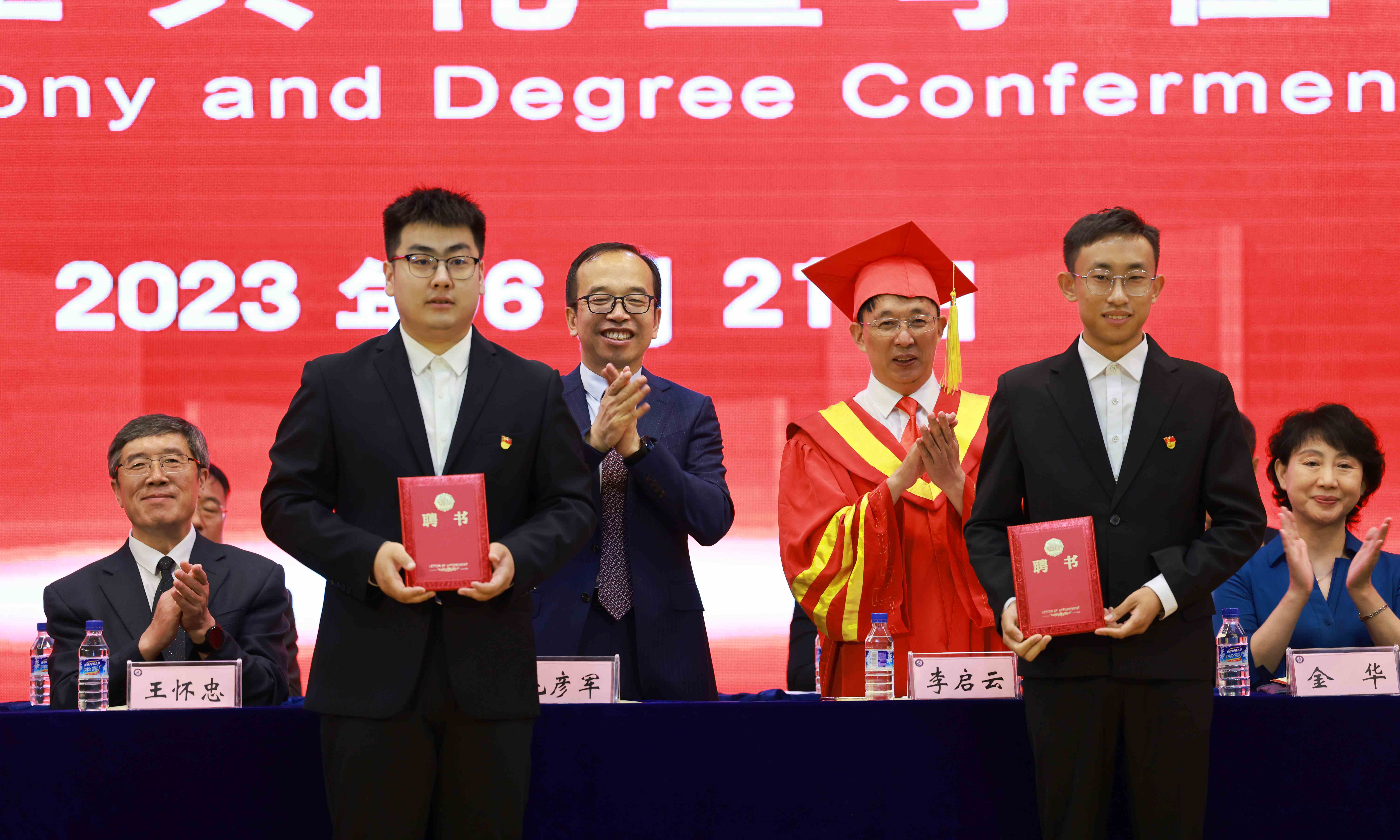 李启云为毕业生代表颁授学位;学校领导为优秀毕业生代表颁奖。