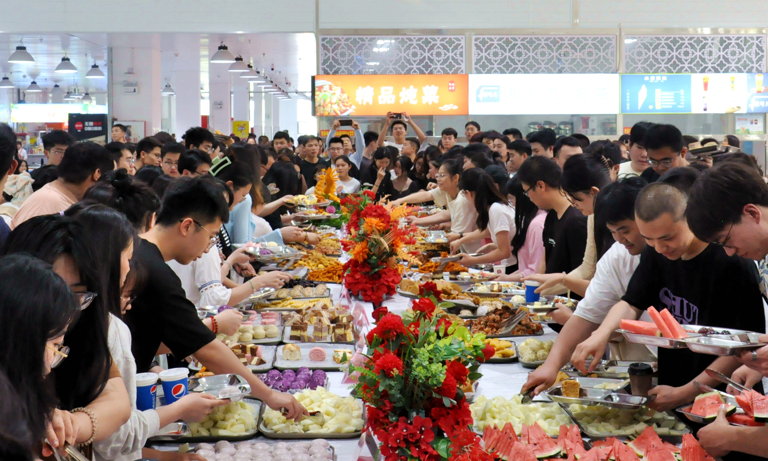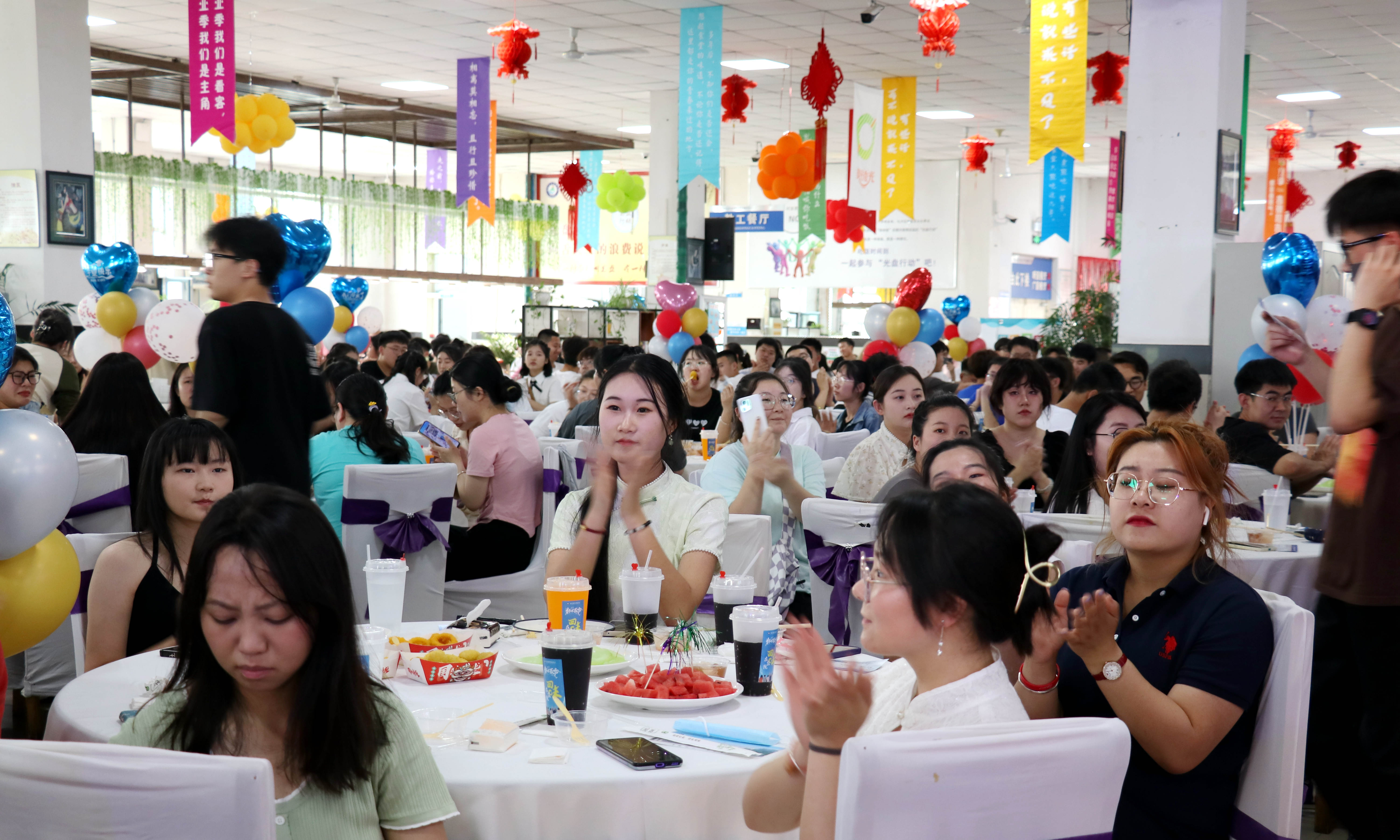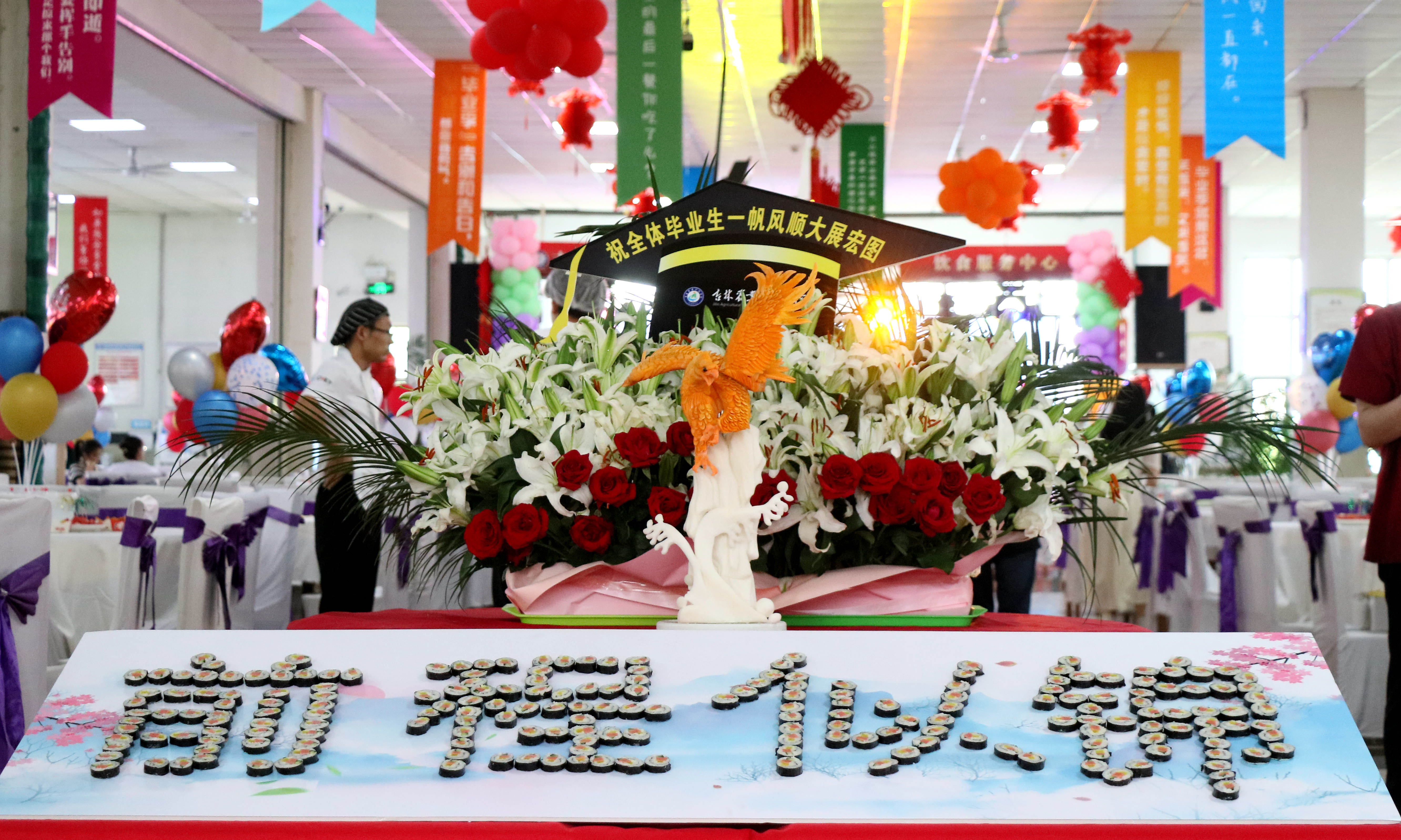 这场美食盛宴是饮食服务中心工作人员经过一个多星期的策划实施精心准备的。白色的桌套、闪亮的丝带、彩色的气球、写着温馨文案的标语牌营造了浪漫的氛围;精美的点心、酥脆的炸物、精致的食品雕刻作品、别具匠心的摆盘饱含着在校师生对毕业生的真挚感情。