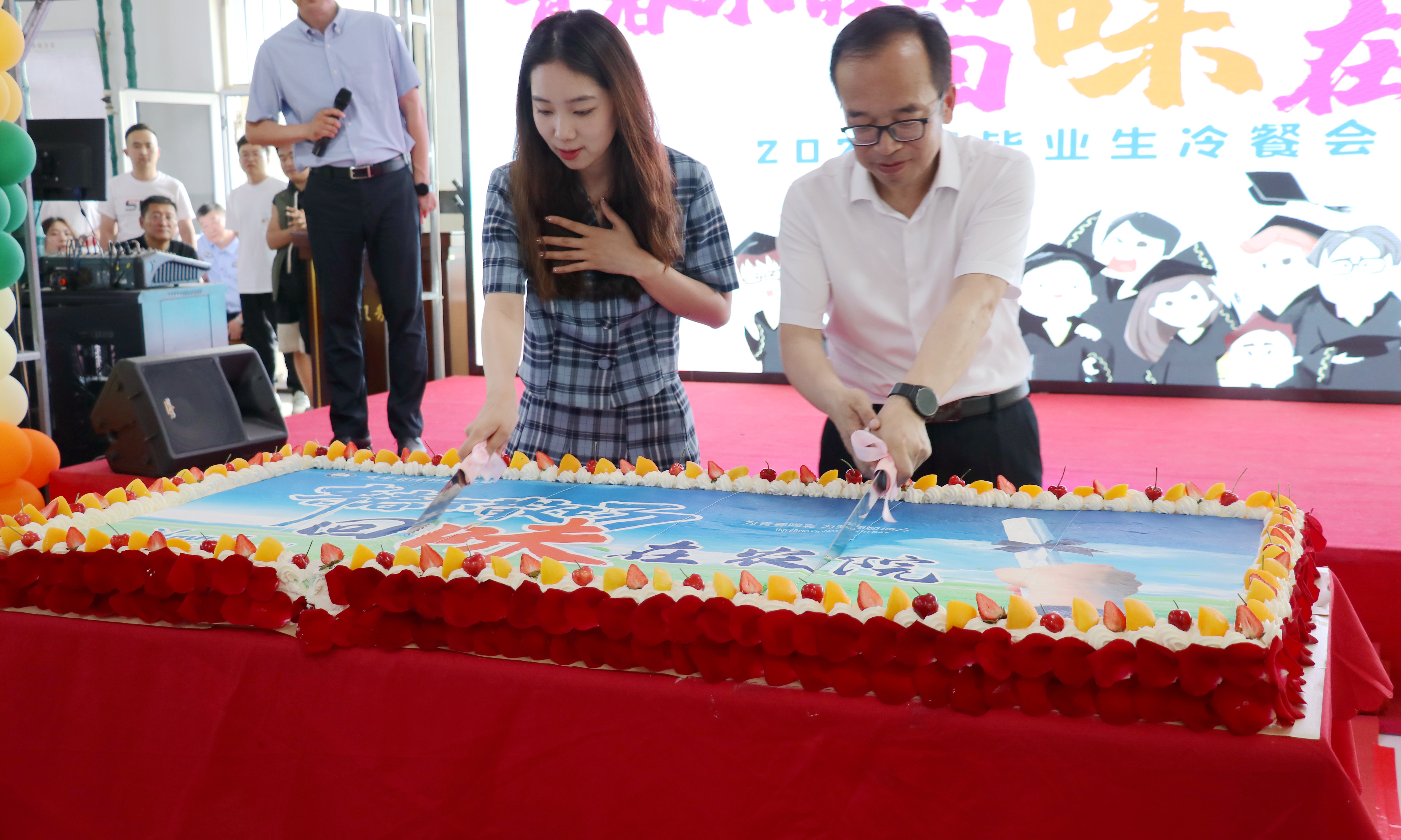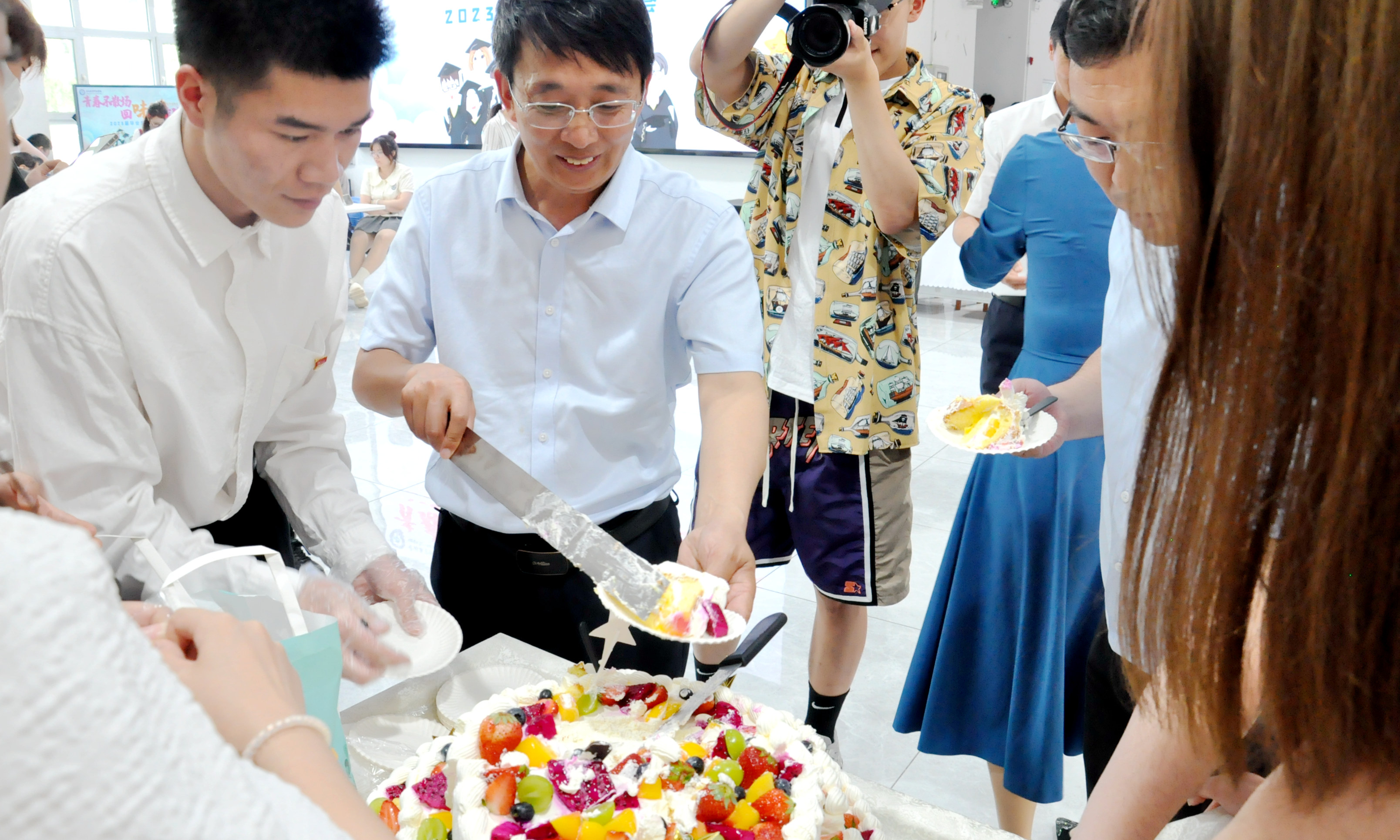 随后,毛彦军、李启云分别在两校区同毕业生代表切蛋糕,宣布冷餐会正式开始。
