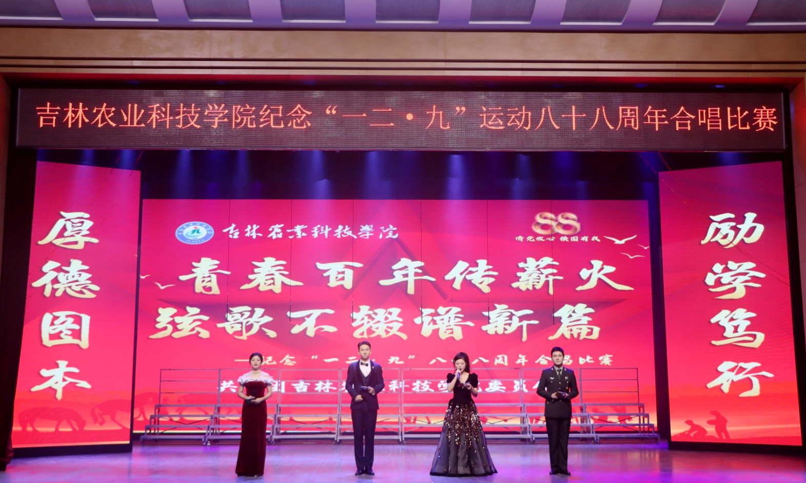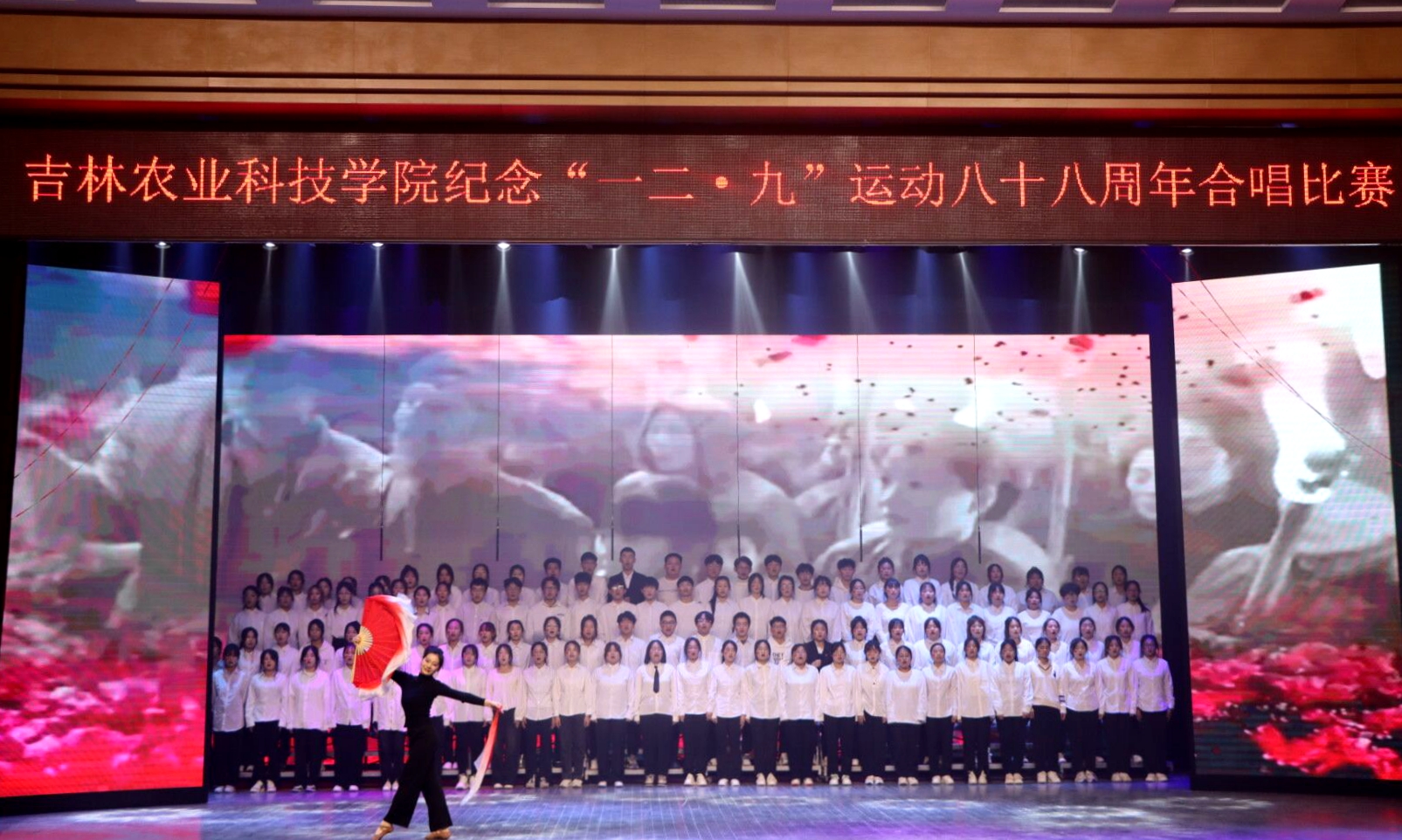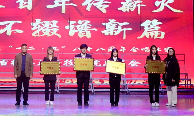 12月6日,学校举办了“青春百年传薪火,弦歌不辍谱新篇”为主题的纪念“一二·九”八十八周年合唱比赛。学校党委书记毛彦军、党委副书记王怀忠、校党委副书记金华、纪委书记白雪、副校长李国江出席本次活动。党委常委、宣传部部长沈宪文,招生就业处处长张大德,学生工作处处长王合峰,发展规划与政策法规处处长马辉,外国语学院副教授薛东慧共同担任本次合唱评委。