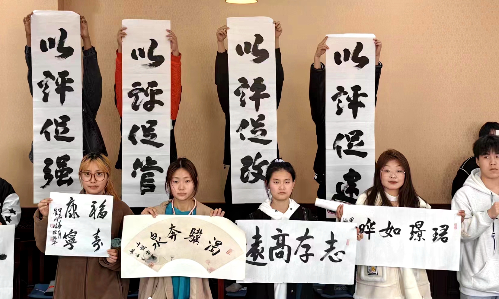 讲座结束后,胡风翔等6位客座教授来到美育工作室,与学生书法爱好者现场交流。书法家们酣畅泼墨,一幅幅字画或刚劲有力、或飘逸灵动、或形神兼备……方寸之间,行云流水,尽显风骨。在场学生领略了书法艺术的博大精深,增强了民族自豪感,进一步坚定了文化自信。