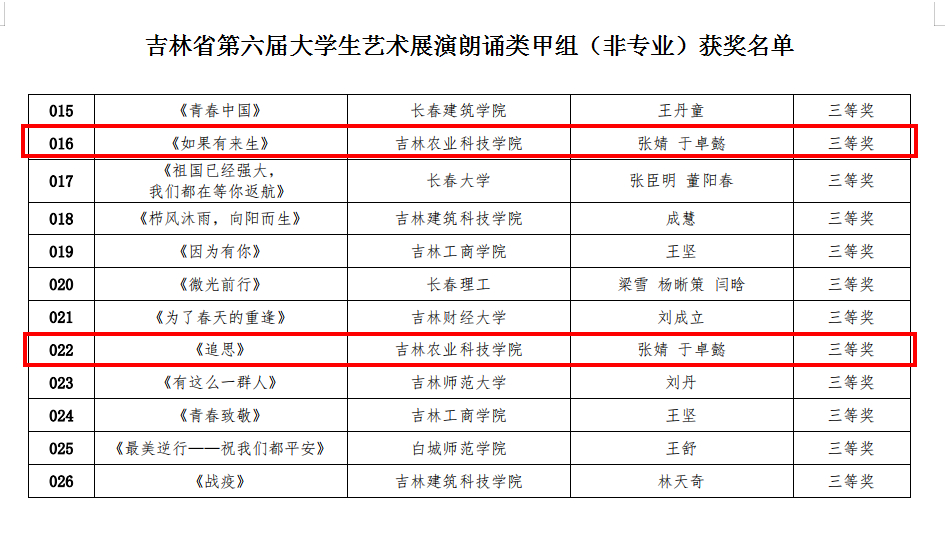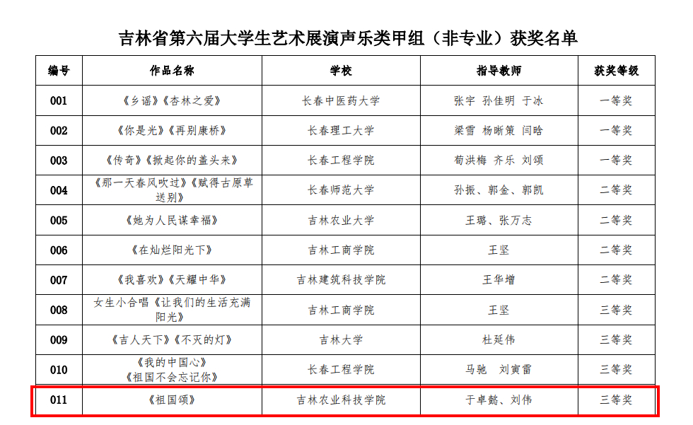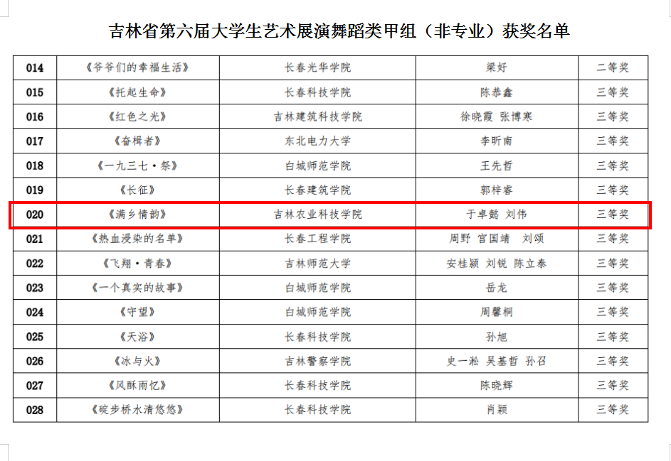 近日,吉林省教育厅公布了吉林省第六届大学生艺术展演活动评审结果。我校共推报4件作品:舞蹈《满乡情韵》、声乐《祖国颂》、朗诵《如果有来生》和《追思》,在全省261件精品艺术表演类作品中全部脱颖而出,均喜获省级三等奖,学校获评优秀组织奖。