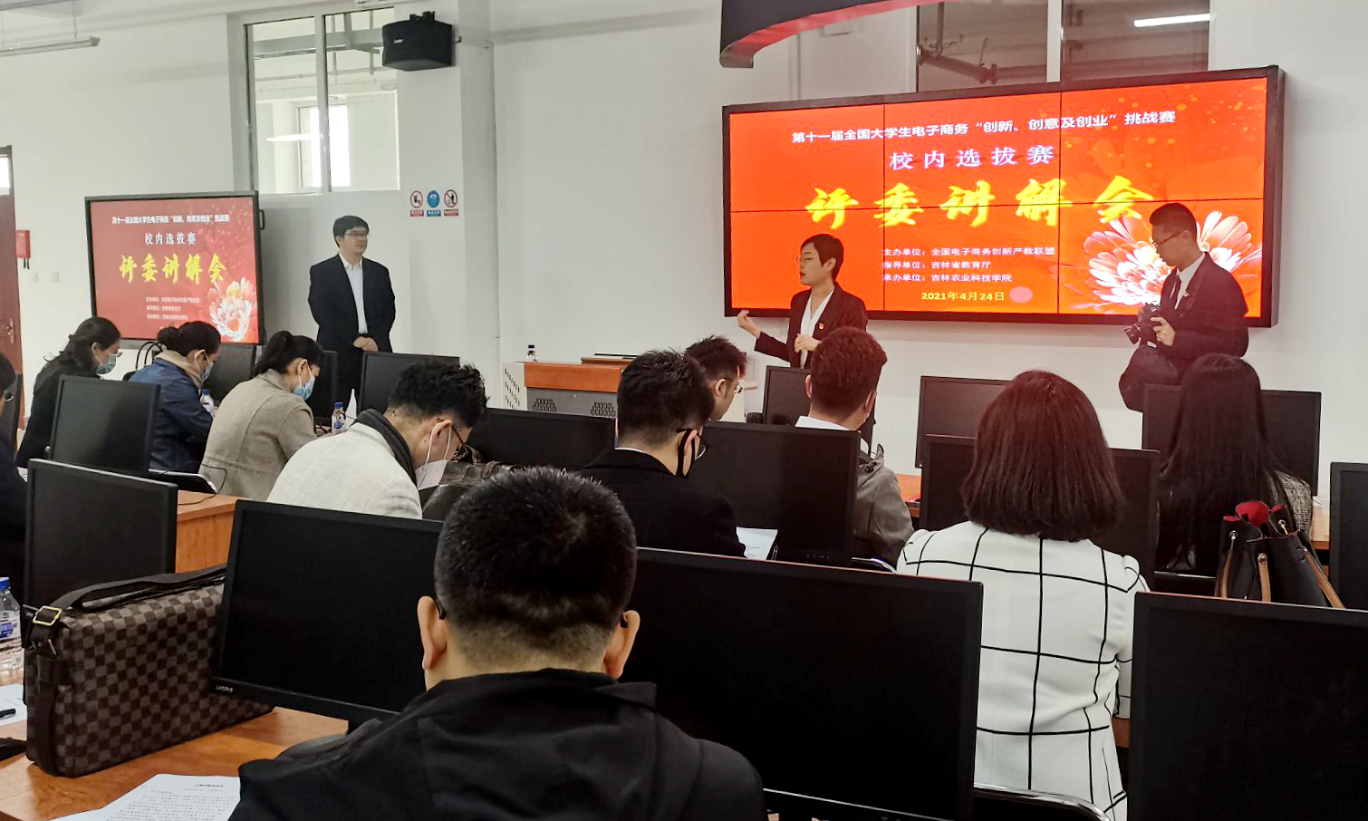 今年,我校继续承办全国大学生电子商务“三创赛”吉林省赛区的组织与管理工作,为更好推进大赛工作的筹备与运行,保证我校参赛作品质量。4月24日,我校举办了“三创赛”校级初赛,由于参赛团队较多,大赛共设置8个赛场,每个赛场17至20支队伍。
