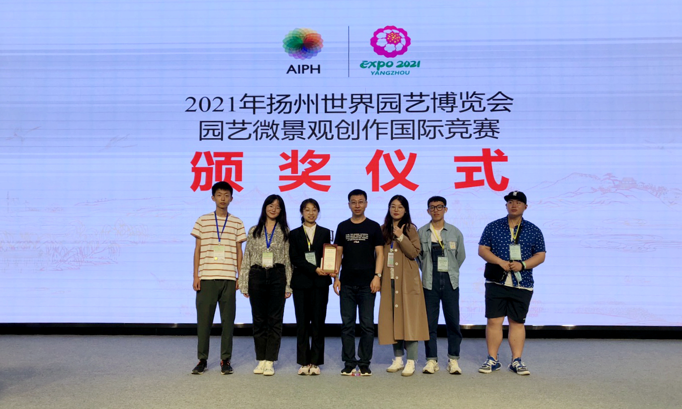 5月26日,2021扬州世园会园艺微景观创作国际竞赛颁奖仪式在国际馆举行。我校农学院教师杨波、于志会带领2018级园林专业王术辉、陈希宁、吕纪庆、邵利平、张健、詹开元斩获铜奖。