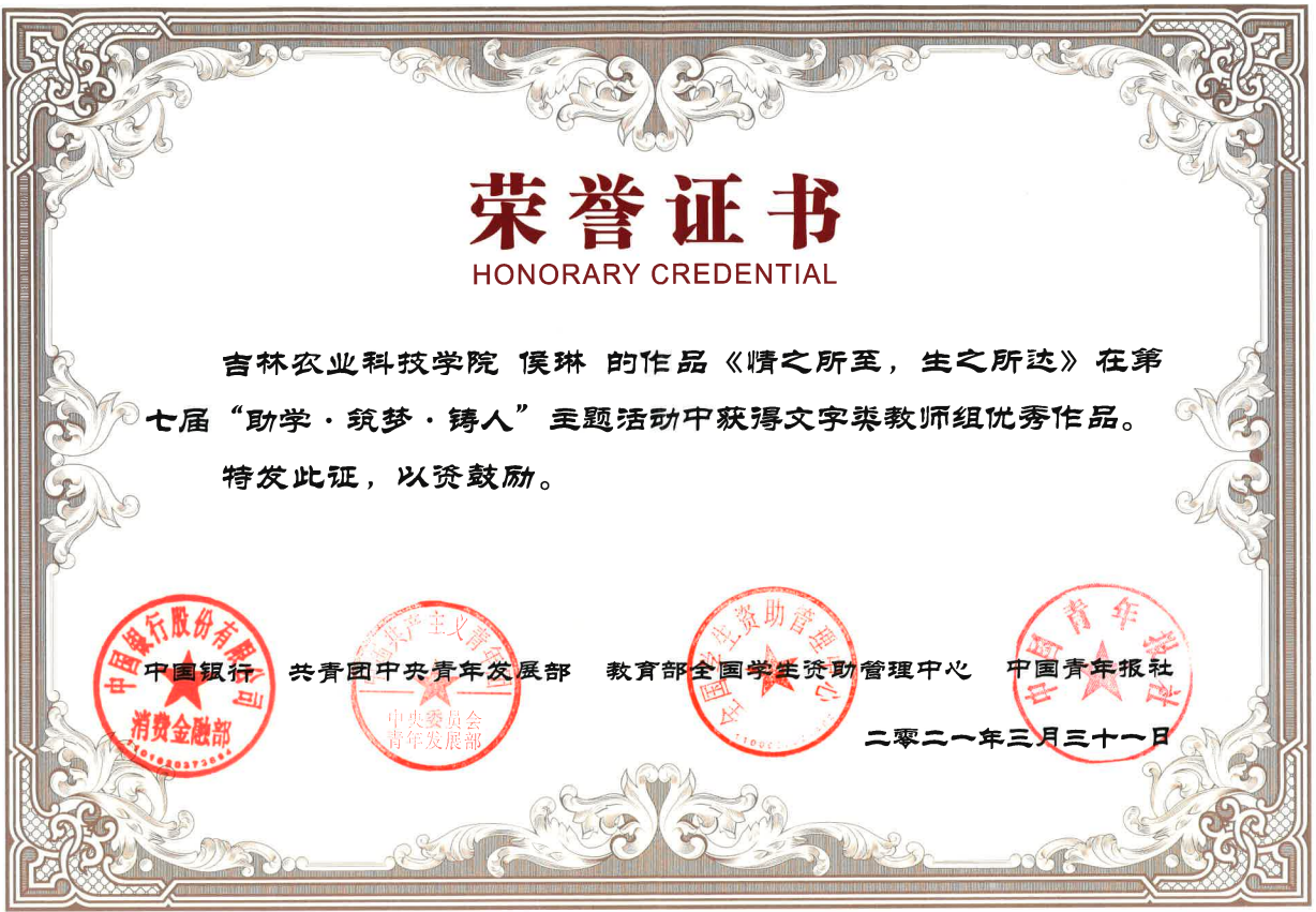 我校学生工作处助学管理科侯琳老师获得本届活动文字类教师组优秀作品。