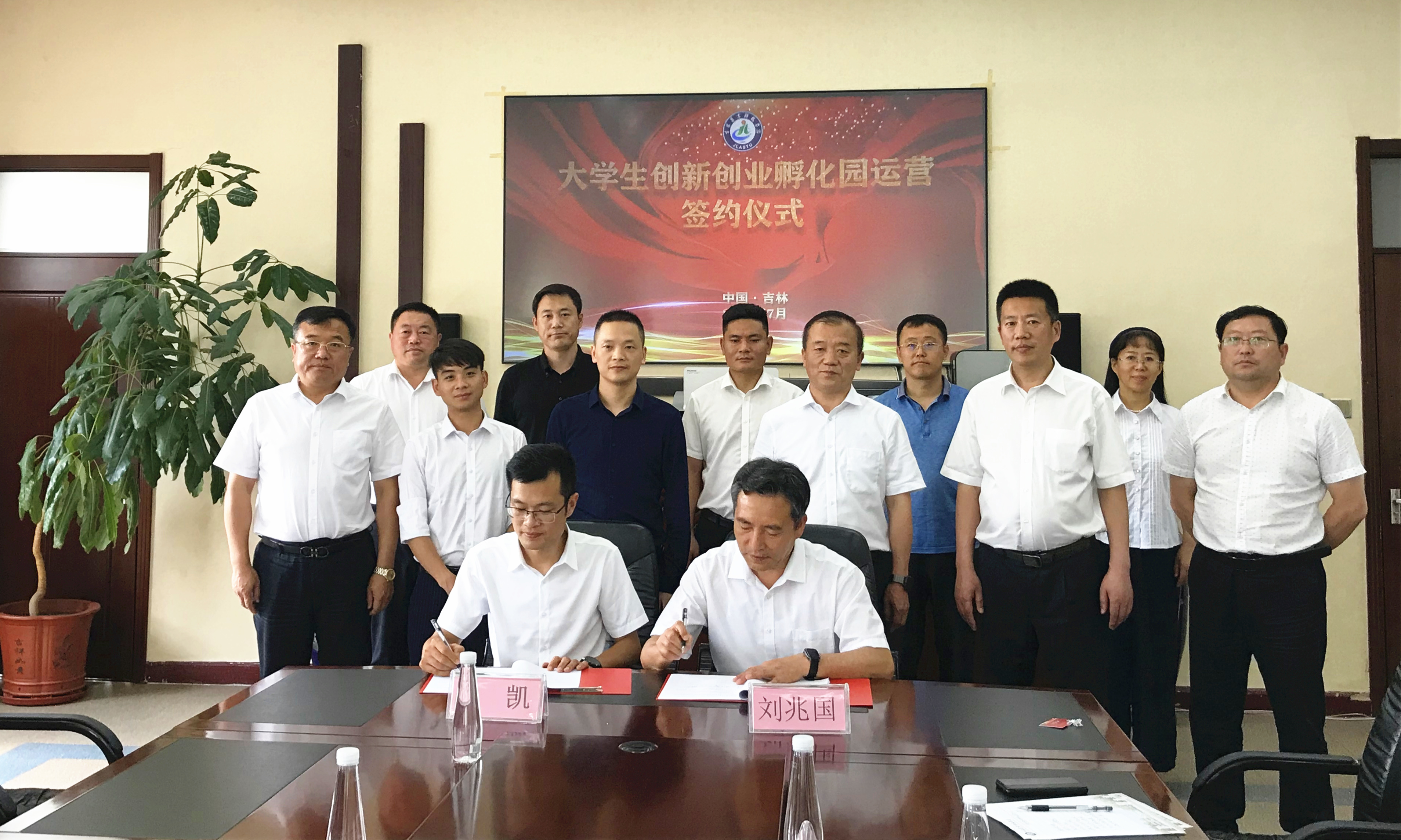 工作人员首先宣读《吉林农业科技学院大学生创新创业孵化园建设协议》。随后,党委副书记刘兆国和吉林江喃海峰企业管理有限公司董事长陈凯在协议上签字,达成合作意向。