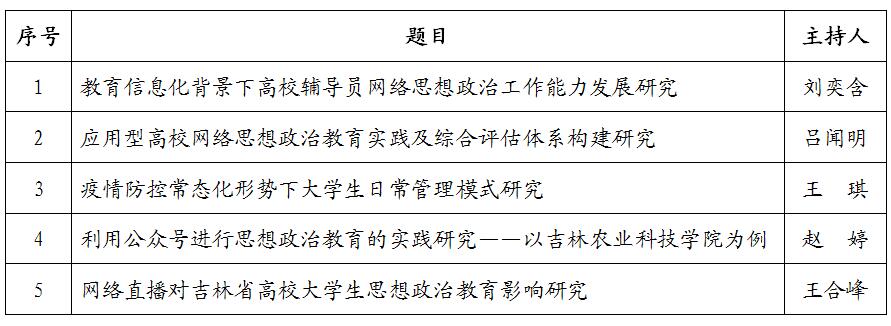 按照《关于做好吉林省高校网络思想政治工作优秀论文征集和研究课题申报工作的通知》要求,经个人申报、学校审核、形式审查等程序,我校共向吉林省高校网络思想政治工作中心推荐申报课题9项。目前,经吉林省高校网络思想政治工作中心组织专家双盲评审,我校获立5项,均为一般课题。