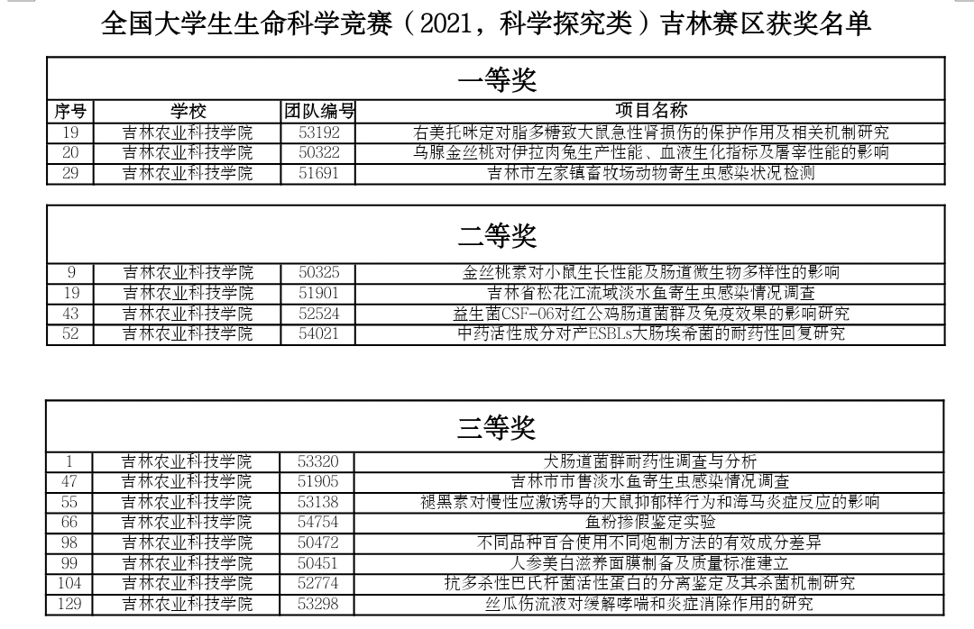 近日,由吉林省教育厅和吉林省科学技术协会主办,吉林大学等单位承办的全国大学生生命科学竞赛(2021,科学探究类)吉林赛区决赛已圆满结束。本次竞赛全省共22个高校464支队伍参赛,竞赛分网络评审和线上答辩两个部分,依据竞赛规则,经过专家评审及竞赛组委会审定,共评出一等奖30项、二等奖63项、三等奖142项。其中,我校获得一等奖3项,二等奖4项,三等奖7项。此次比赛由创新创业工作处组织,得到了校领导、各相关学院的大力支持,通过比赛学生能够把理论知识与实践能力融为一体,动手能力和分析能力都得到了培养和锻炼。