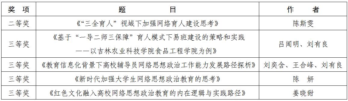 9月28日,吉林省高校网络思想政治工作中心公布“2020年度全省高校网络思想政治工作优秀论文征集”评选结果。经个人申报、学校审核、主题契合性筛选等程序,通过专家盲审和知网重复率检测,最终遴选出一等奖10篇,二等奖16篇,三等奖21篇。我校上报5篇论文,均获得奖项。
