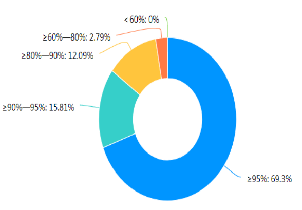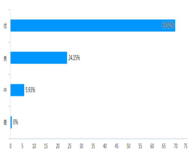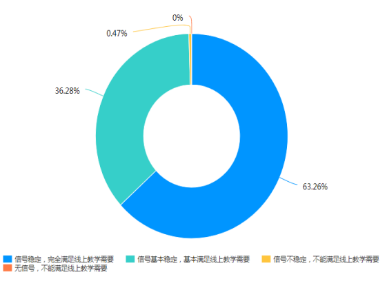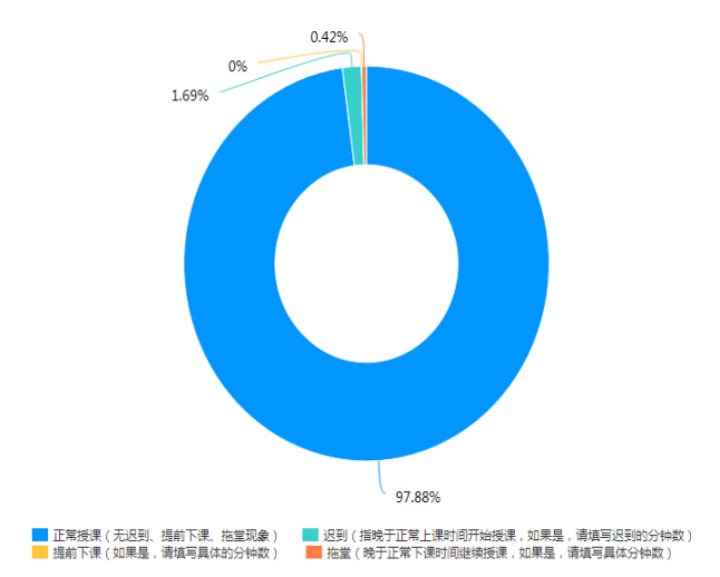 结合校院两级督导和教师自评的结果来看,教学秩序较好,教师都能提前进入课堂,调动学生精神状态,布置课后学习,对学生的考勤、提问、互动等方式灵活开展。99.54%以上的网络运行情况能满足教学;97.88%的教师和63.26%的学生按时上下课,师生状态饱满,还有36.74%的学生学习状态一般;80.68%的课堂学生到课率达到90%以上,还有3.81%的课堂学生到课率未达到80%。