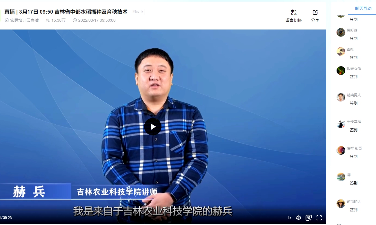 在科技处号召下,多名教师积极参加各级政府部门、广电媒体组织的备春耕直播活动并作专题讲座。农学院赫兵于3月17日在省农业农村厅主办的“2021-2022年吉林省冬春农民线上培训和在线咨询活动”中上作了题为《吉林省中部水稻播种及育秧技术》的专题讲座,观看讲座人数达15.38万人。
