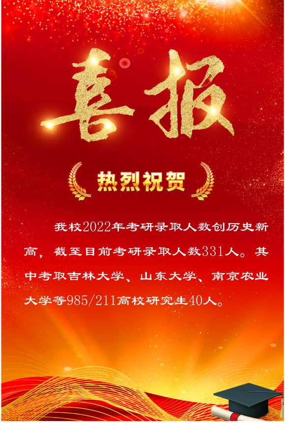 面对疫情防控带来的深刻影响,学校始终以高质量就业为突破口,以不懈努力的坚守,责任在肩的担当,大力推动学生考研、参加公考、事业单位招考、自主创业。截至目前,我校学生考研喜报频传,考研录取人数331人,创我校考研录取人数历史新高。其中考取吉林大学、山东大学、南京农业大学等985/211高校研究生40人。