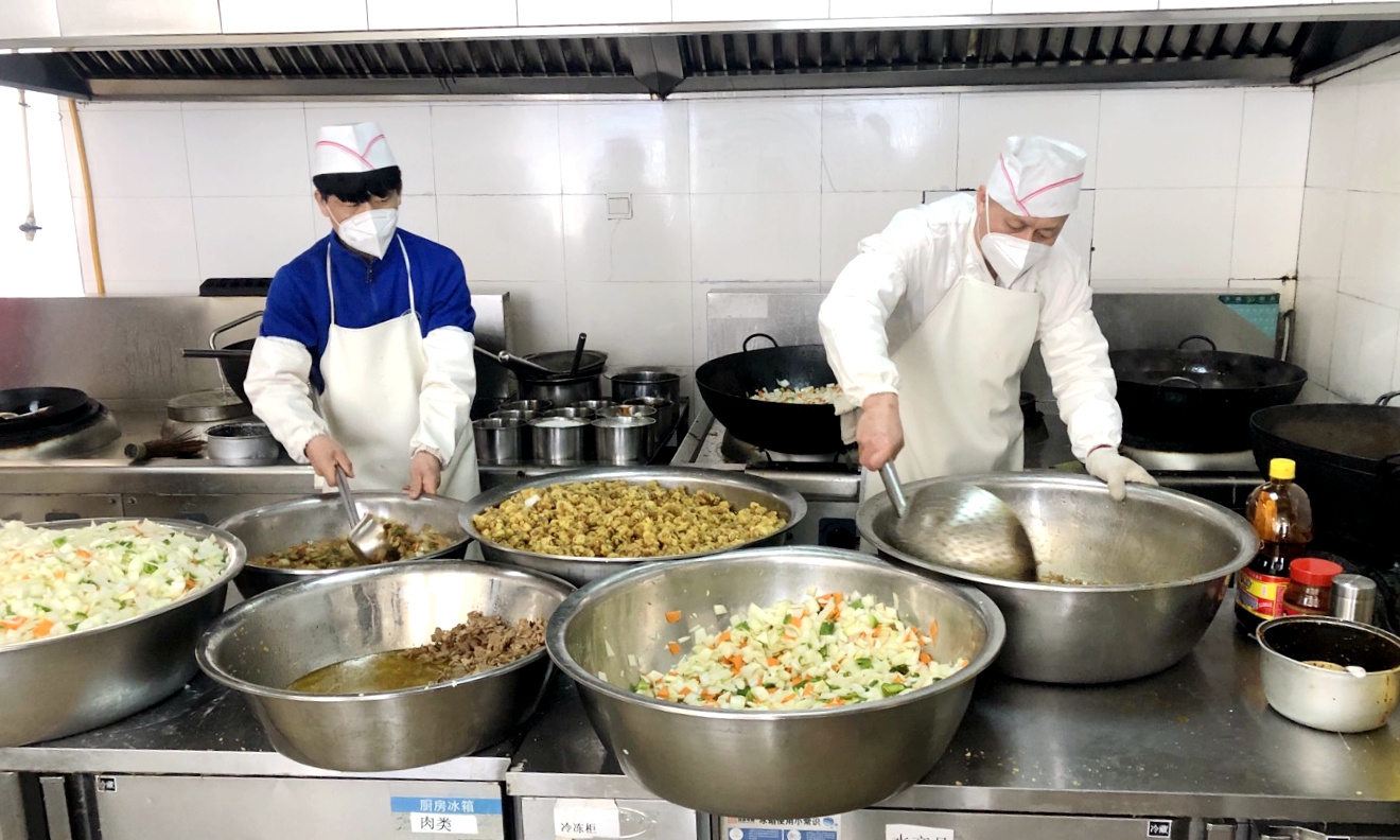 抗击疫情、粮草先行——隔离期满学生返校后,培训中心的12名员工和2名志愿者每天承担800余名学生和教职员工的一日三餐。起早贪黑,成了他们的家常便饭。从食材的准备和烹饪,到物资的搬运和转运,再到环境消杀,他们承担着不同角色,超强的工作负荷甚至让几名员工累倒在了操作台上,可是他们经过短暂地休息,却依然坚守在各自的岗位上。培训中心主任刘启锋对大家讲:“这就是一场没有硝烟的战争,覆巢之下无完卵,我们不仅是为了学校,也是为了各自的家庭在努力。为了共同的目标,我们必须满怀一腔热血,用超强的意志力逆行坚守。”