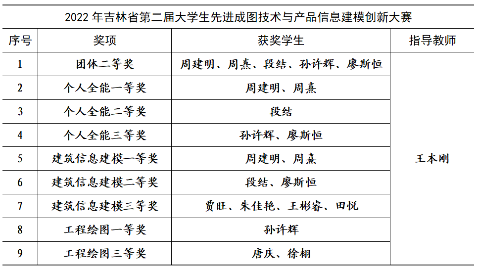 机械与土木工程学院BIM创新工作室、BIM协会于4月30日举办了校内第三届先进成图与产品信息建模大赛暨本次大赛的校内选拔赛,选拔出9名工程造价专业和3名土木工程专业学生共12人组成了建筑类代表队。在王本刚老师的指导下,经过激烈角逐,凭借扎实的专业知识和熟练的二维制图、三维建模软件操作技巧,最终机械与土木工程学院周建明、周熹同学个人全能成绩排在全省第一、第二,并获得个人全能一等奖。此外,代表队获团体二等奖1项、个人全能二等奖1项、三等奖2项;获建筑信息建模一等奖2项、二等奖2项、三等奖4项;获工程绘图一等奖1项、三等奖2项。