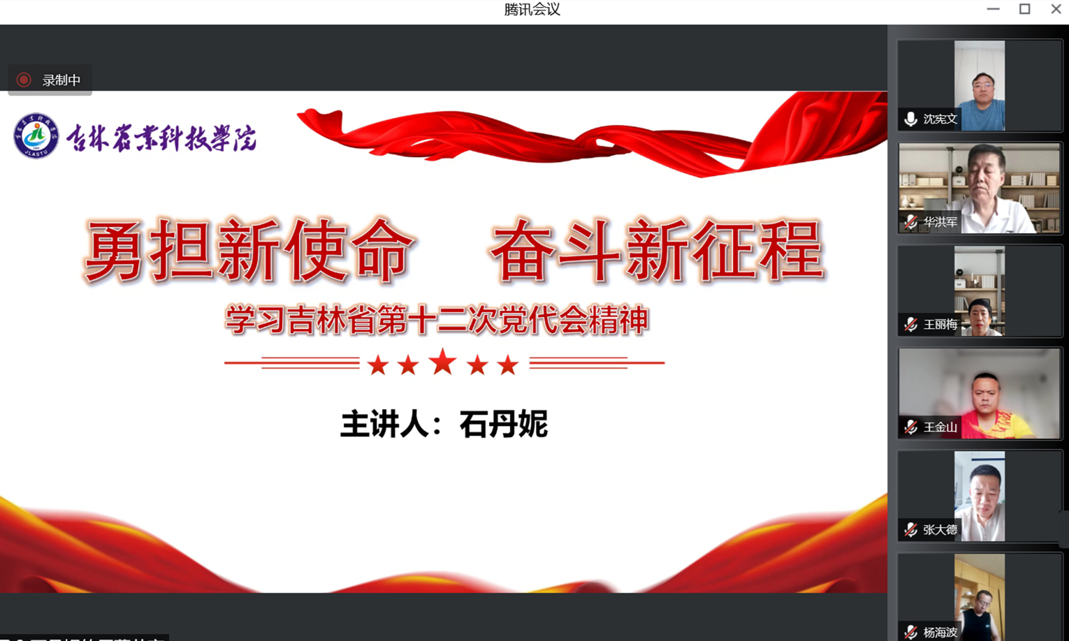 会上,党委副书记、校长谢景武领学传达了省第十二次党代会精神;党委副书记王怀忠结合分管工作作了题为《立足新发展阶段,全面贯彻“三全育人”体系》中心发言;动物科技学院院长赵翠青作《高举旗帜牢记嘱托舵稳奋楫风劲扬帆》交流发言。马克思主义学院副教授石丹妮为全体参会人员作了《勇担新使命,奋斗新征程——学习吉林省第十二次党代会精神》专题辅导报告。