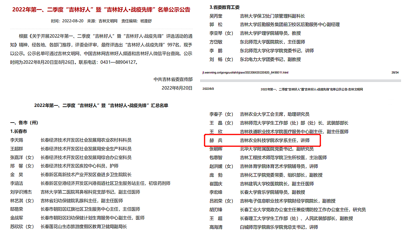 根据《关于开展2022年第一、二季度“吉林好人”暨“吉林好人·战疫先锋”评选活动的通知》精神,经各地、各部门推荐,评委会评审,最终评选出“吉林好人·战疫先锋”997名。我校农学院农学系主任赫兵获评该荣誉称号。