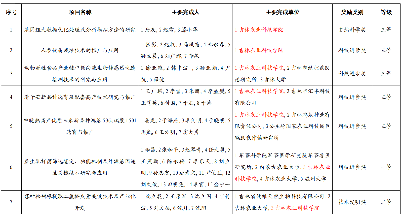 12月5日,吉林省科学技术厅奖励处下发了《吉林省人民政府关于2022年度吉林省科学技术奖励的决定》。我校获奖7项,其中,作为第一完成单位获吉林省自然科学三等奖1项、获吉林省科技进步三等奖4项;参与单位获一等奖1项,二等奖1项。希望获奖者珍惜荣誉,再接再厉,持之以恒弘扬科学精神,努力在新起点上展现新作为、创造新成绩。