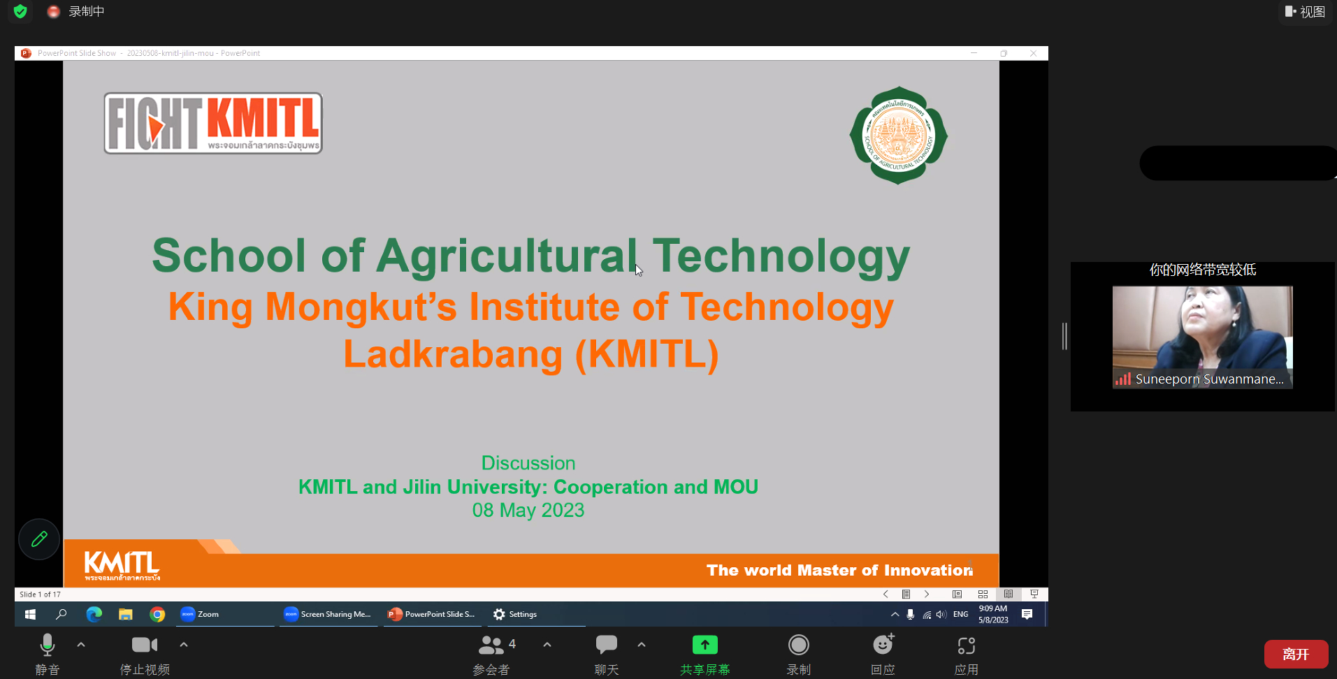 5月8日,我校与泰国先皇理工大学举行线上会议,就两校共同开展国际交流活动进行深入交流和探讨。我校中药学院院长张影、副院长李敏、李雨霏老师,农学院副院长陈少鹏、史春凤老师,国际合作与交流处副处长闫玲玲,综合科科长王钰维、李龙飞老师以及相关工作人员参加了会议。先皇理工大学农学院助理教授Ananya Jarernpornnipat博士、Suneeporn Suwanmaneepong副教授、Lampan Khurnpoon助理教授、外事办负责人Kulthida Supnoi女士、Christopher Llones先生参加本次会谈。