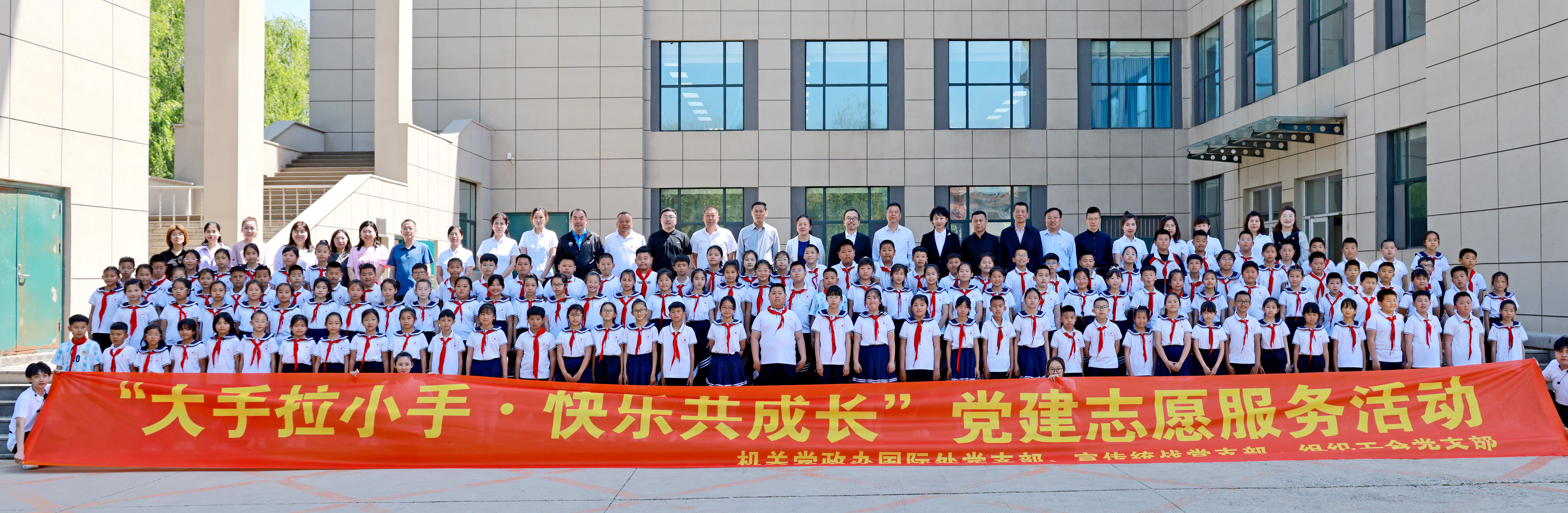 在“六一”儿童节即将来临之际,机关党总支党政办国际处支部、宣传统战支部、组织工会支部联合开展“大手拉小手、快乐共成长”主题党日活动。学校领导毛彦军、金华、潘力以普通党员身份参加活动与吉林经开区管委会副主任刘波、教育局局长张向荣一道,同来自双吉小学的300余名小朋友合影留念,共祝他们节日快乐。