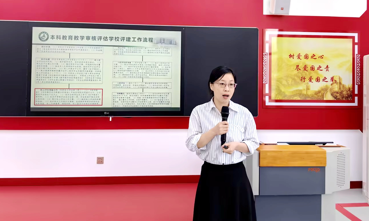 学校评建工作办公室刘喜峰老师从评建流程、时间节点、专家构成、评估方式等四个方面进行了系统阐述,细致讲解了新一轮审核评估指标体系、自评报告撰写、问题清单梳理等方面的工作经验,介绍了学校自评自建、线上评估、入校评估等环节的工作方式和进度安排。