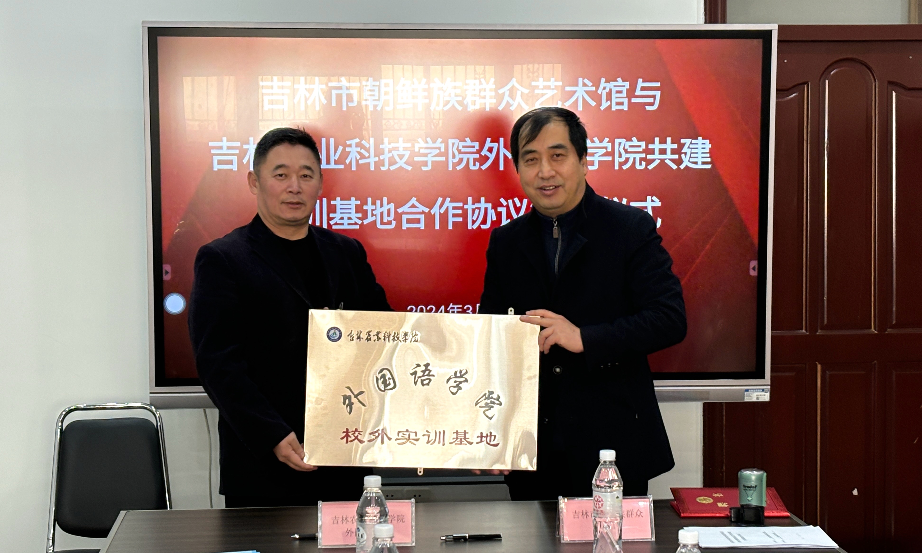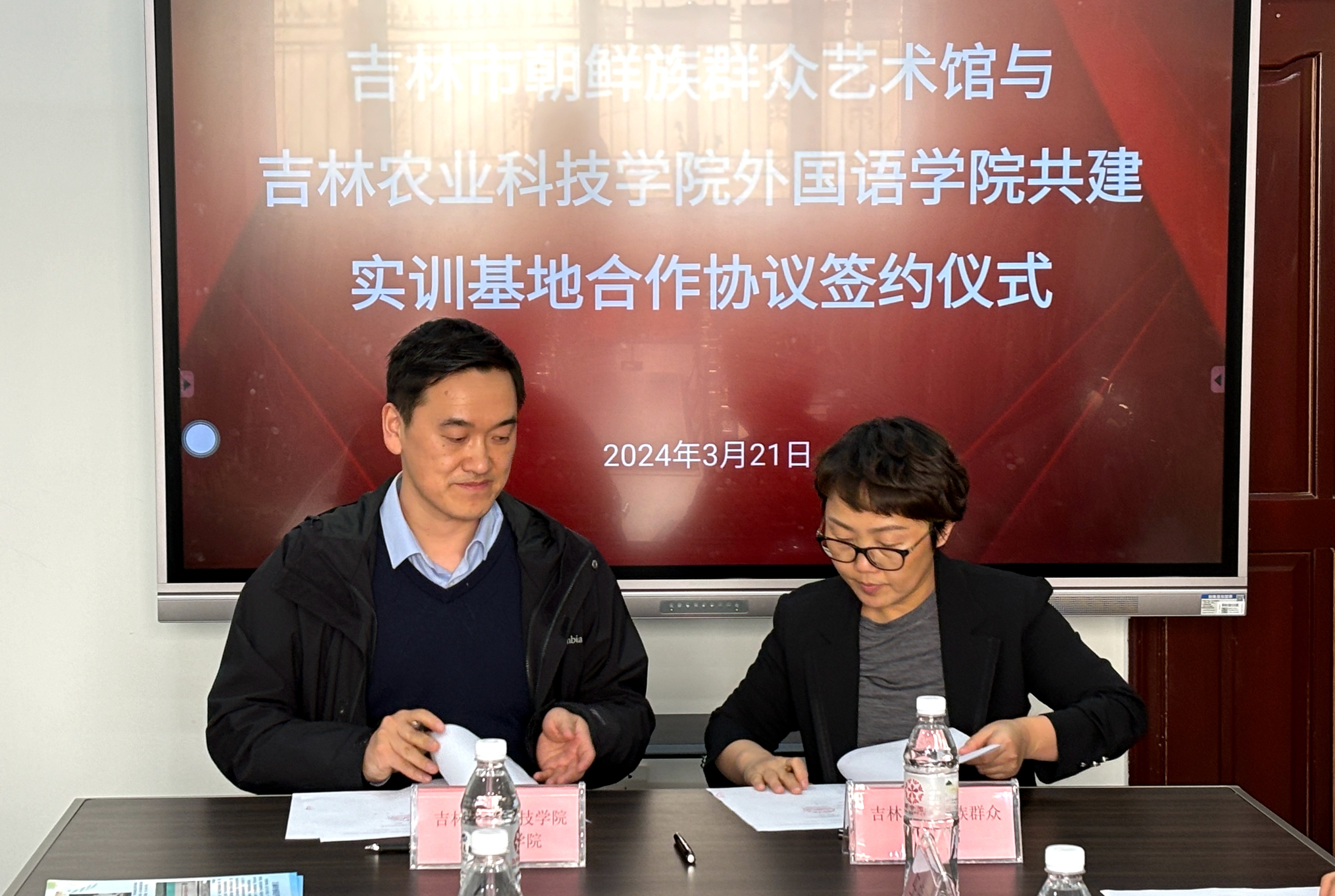 3月21日下午,吉林农业科技学院外国语学院与吉林市朝鲜族群众艺术馆共同举行共建实训基地合作协议签约仪式。朝鲜族群众艺术馆的书记、馆长郑敏,副馆长朴建国、李永日,调研部(非遗部)主任车虎顺,调研部成员金雯及外国语学院领导班子、相关教师代表共同参加仪式。