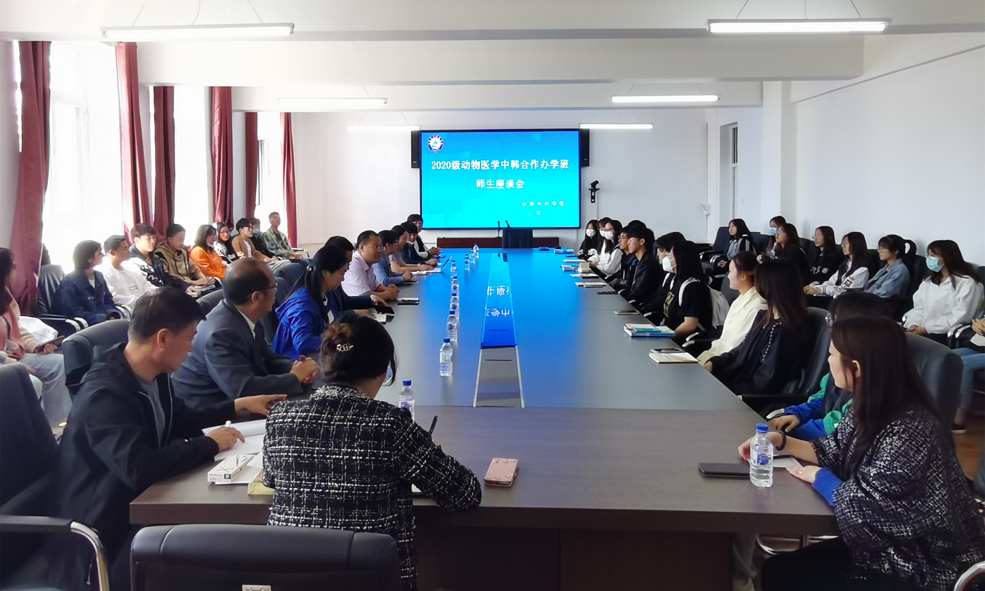 动物医学中韩合作班全体学生和国际合作与交流处副处长闫玲玲、韩国中部大学与中国高校中外合作办学项目负责人金香春老师和李正鑫老师及学院相关领导教师参加座谈。
