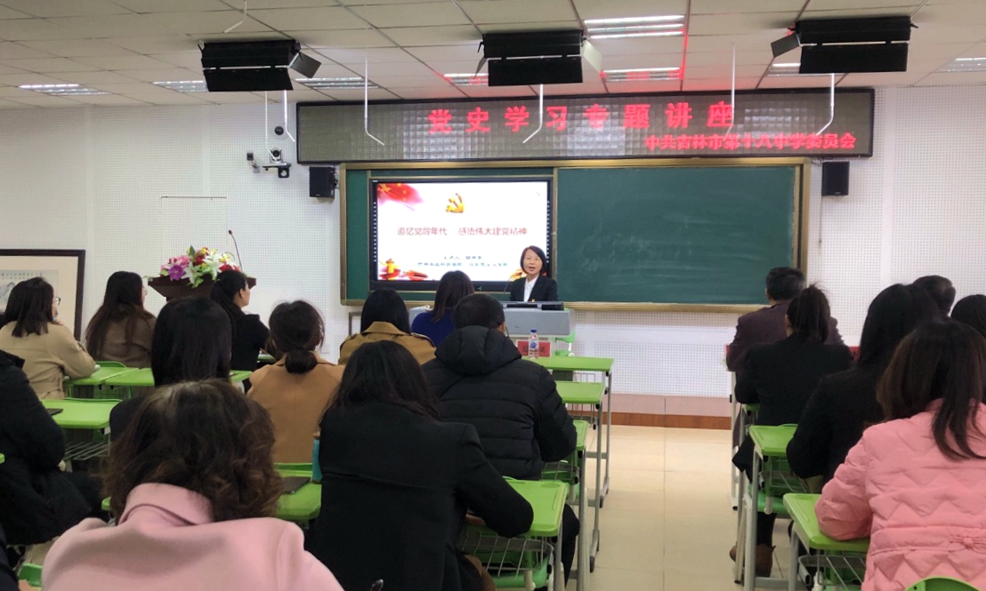 随后,邸艳英教授以“追忆觉醒年代、感悟伟大建党精神”为主题,给吉林市第十八中学的全体党员教师作党史学习教育专题讲座。围绕“反侵略战争,少数革命者觉醒”、“全民族意识觉醒,中国共产党诞生”、“赓续红色血脉,弘扬伟大建党精神”三个板块,讲述了伟大建党精神形成的历史脉络与深刻内涵。讲座内容生动详实、逻辑清晰,赢得了现场阵阵掌声。