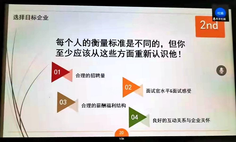 禾丰集团杜娟经理在线上为学生分享毕业生就业面试技巧。她从什么是“面试”、更好地了解自己、选择目标岗位、做好简历的注意事项、各种面试应对方法五个方面进行了详细的阐述。她向同学们介绍了禾丰集团基本情况,欢迎动物科技学院毕业生选择禾丰开启职业生涯。