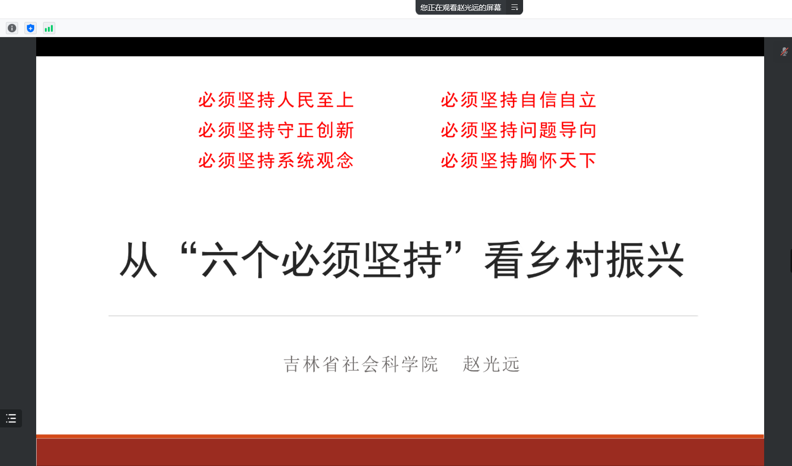 赵光远主要从“六个必须坚持”的重大意义、“六个必须坚持”与乡村振兴、“六个必须坚持”与科研深化等方面分享了体会,深刻剖析乡村振兴在“人民至上、自信自立、守正创新、问题导向、系统观念和胸怀天下”六个视角下相互辩证关系,诠释了乡村振兴与生产力和生产关系的协调发展。赵光远结合多年的科研工作和咨询报告撰写分享了“六个必须坚持”与科研深化的有机融合优秀经验成果,报告具有极强的理论性和指导性。