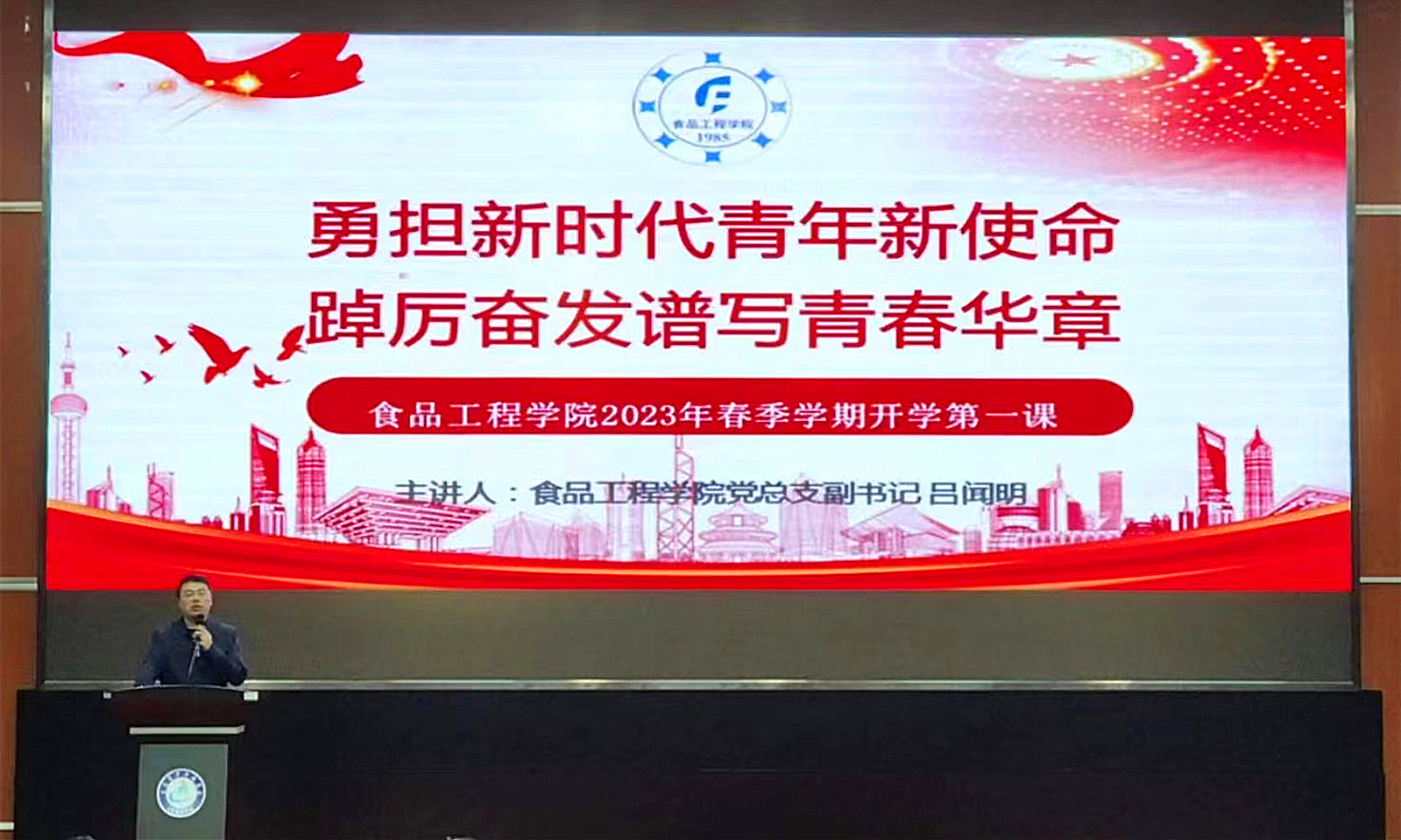 为深入学习贯彻党的二十大精神,进一步推动党的二十大精神进校园、进课堂、进头脑,增强当代青年担当责任,3月9日下午6点,食品工程学院在图书馆报告厅举办“开学第一课”主题报告会。学院党总支副书记吕闻明以《勇担新时代青年新使命、踔厉奋发谱写青春华章》为题作报告,报告会由食品工程学院团委书记谢天主持。