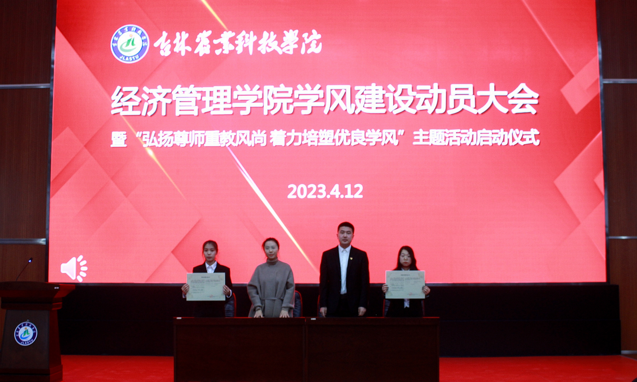 学院副院长孙鹏程从“为什么开展学风建设”和“学生怎样参与学风建设”两个问题出发进行阐述,进一步提高同学们对培养优良学风的认识。辅导员姚远宣读《经济管理学院学风建设活动方案》,辅导员刘新雨宣读活动倡议书。教师代表张赫楠、学生代表周家漩分别从引导者和参与者的角度论述良好学风和尊师重教的重要性。学院党总支书记赵世文寄语全院师生,要胸怀“国之大者”,为国家富强、民族振兴、人民幸福而学。