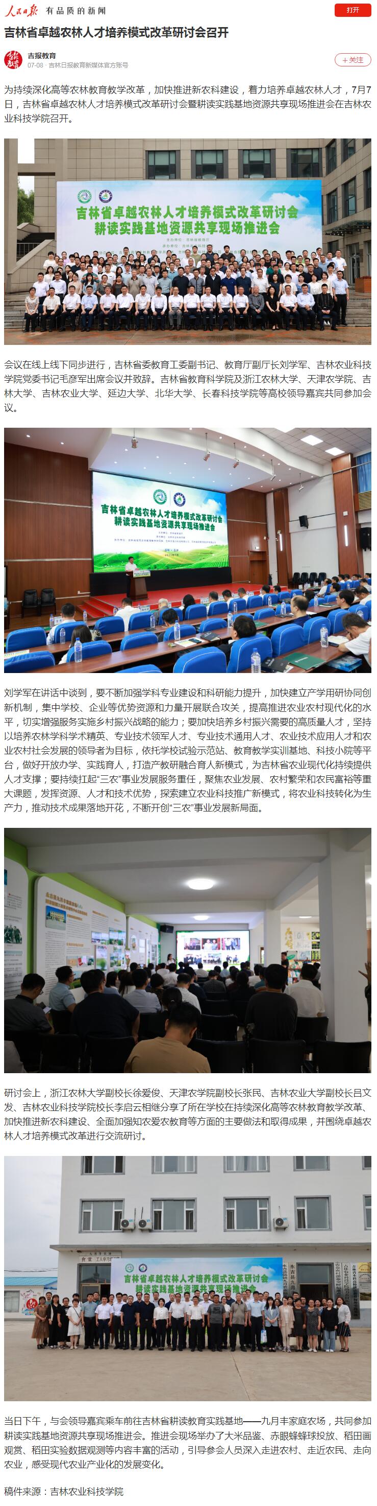 7月7日,由吉林省教育厅主办,吉林农业科技学院承办,吉林省高等农林教育教学共同体、吉林市海川科技有限公司、吉林省超星信息技术有限公司协办的吉林省卓越农林人才培养模式改革研讨会暨耕读实践基地资源共享现场推进会顺利召开。活动得到了吉林日报、吉林教育电台等多家媒体报道。