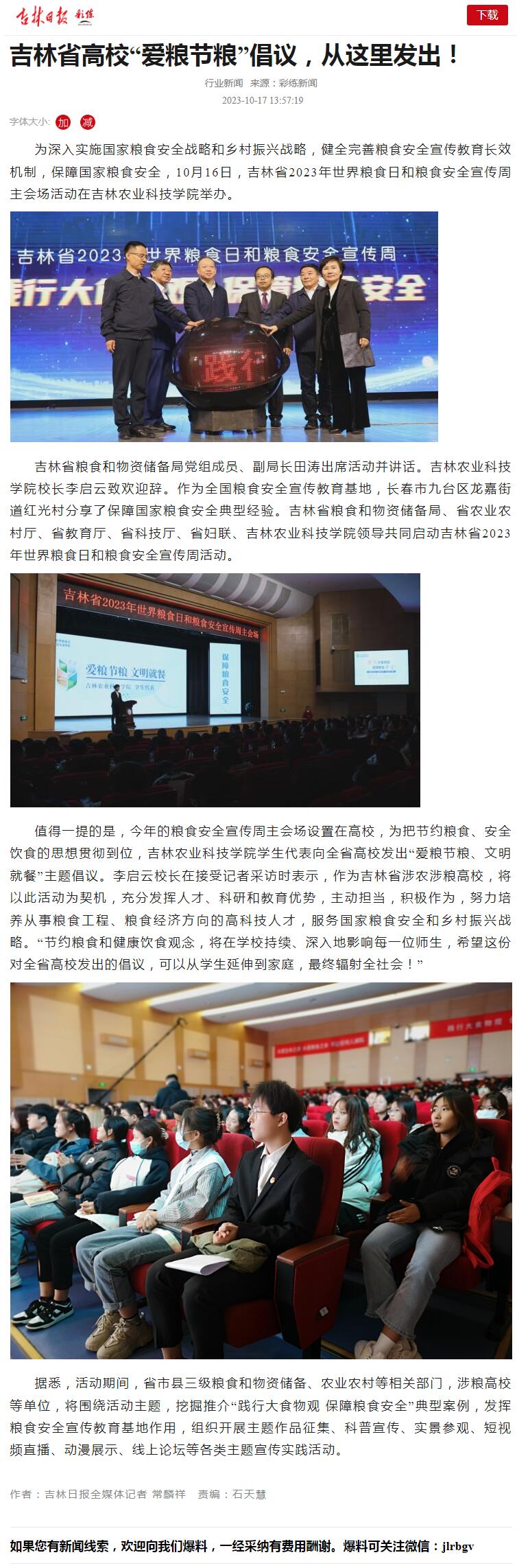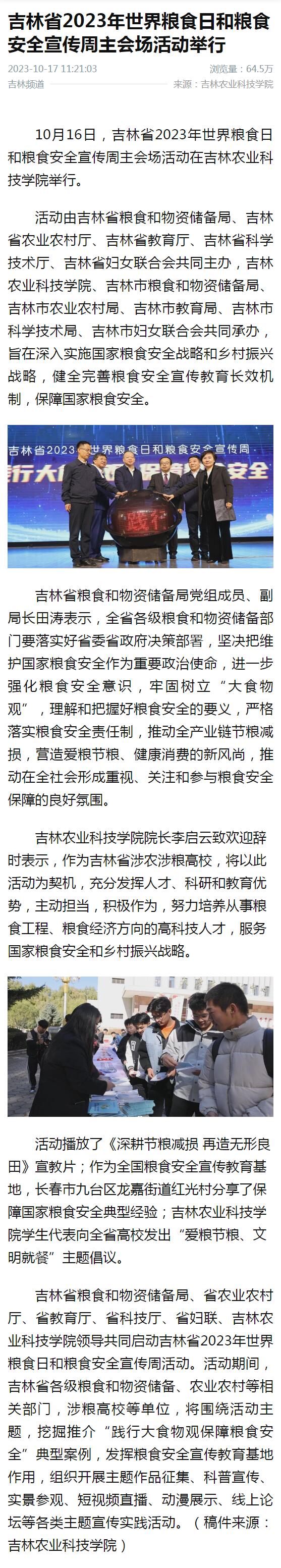 10月16日,吉林省2023年世界粮食日和粮食安全宣传周主会场活动在吉林农业科技学院举行。活动旨在深入实施国家粮食安全战略和乡村振兴战略,健全完善粮食安全宣传教育长效机制,保障国家粮食安全。活动得到新华社、吉林日报等多家媒体报道。