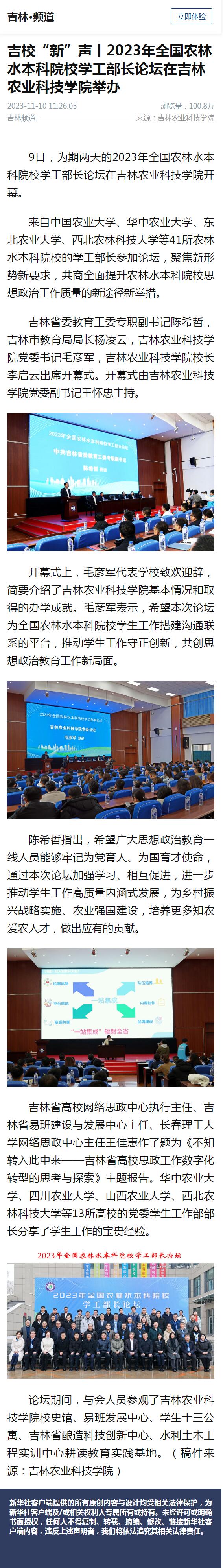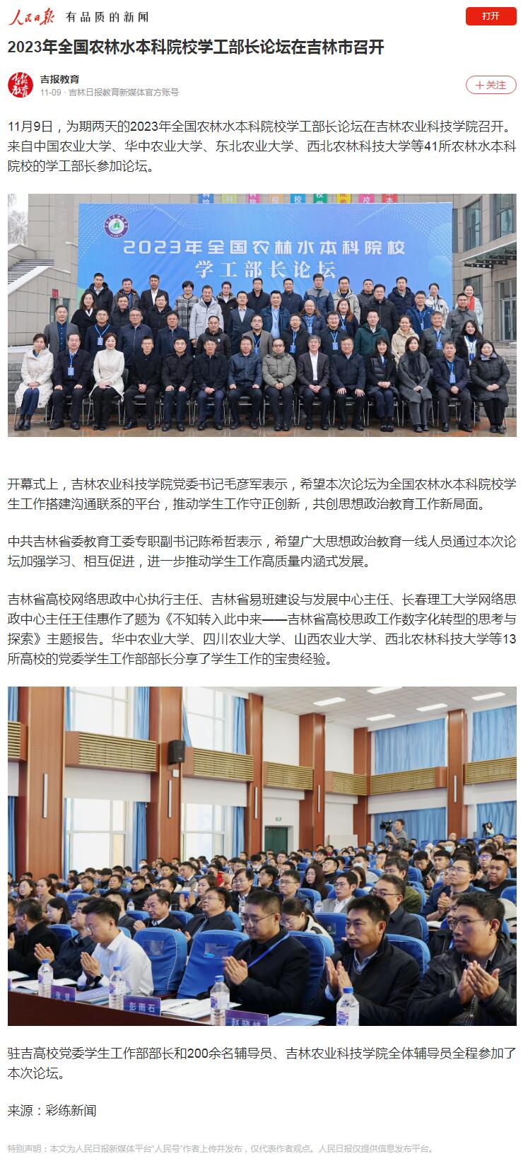 11月9日,为期两天的2023年全国农林水本科院校学工部长论坛在吉林农业科技学院召开。来自中国农业大学、华中农业大学、东北农业大学、西北农林科技大学等41所农林水本科院校的学工部长参加论坛,聚焦新形势新要求,共商全面提升农林水本科院校思想政治工作质量的新途径新举措。