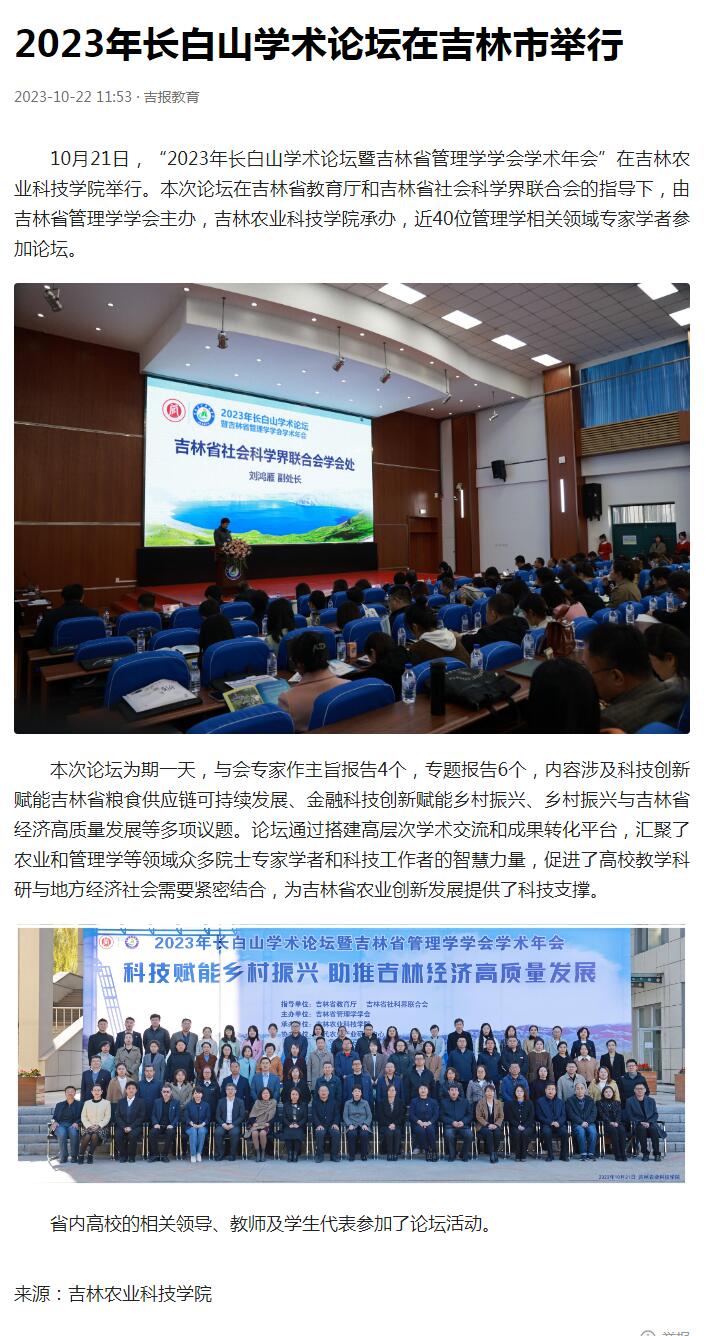 10月21日,“2023年长白山学术论坛暨吉林省管理学学会学术年会”在我校举行。论坛作主旨报告4个,专题报告6个,内容涉及科技创新赋能吉林省粮食供应链可持续发展、金融科技创新赋能乡村振兴、乡村振兴与吉林省经济高质量发展等多项议题,为我省农业创新发展提供了科技支撑。活动得到吉林日报·吉报教育报道。