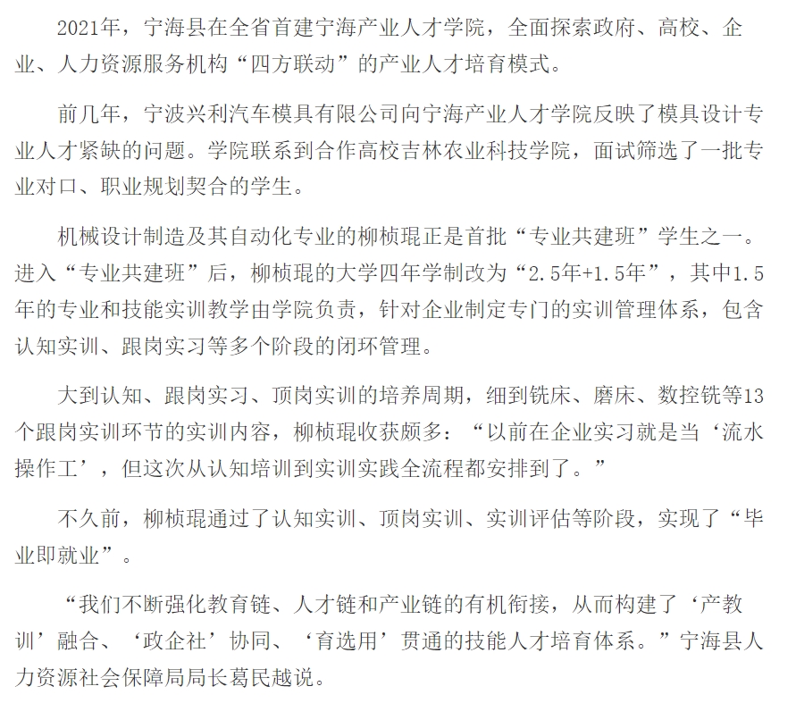 日前,该模式在化解就业矛盾中发挥了积极作用,得到人民日报关注报道,我校2023届机械设计制造及其自动化专业毕业生柳桢琨在采访中表示,通过校企合作专业共建平台,真正实现了“毕业即就业”。