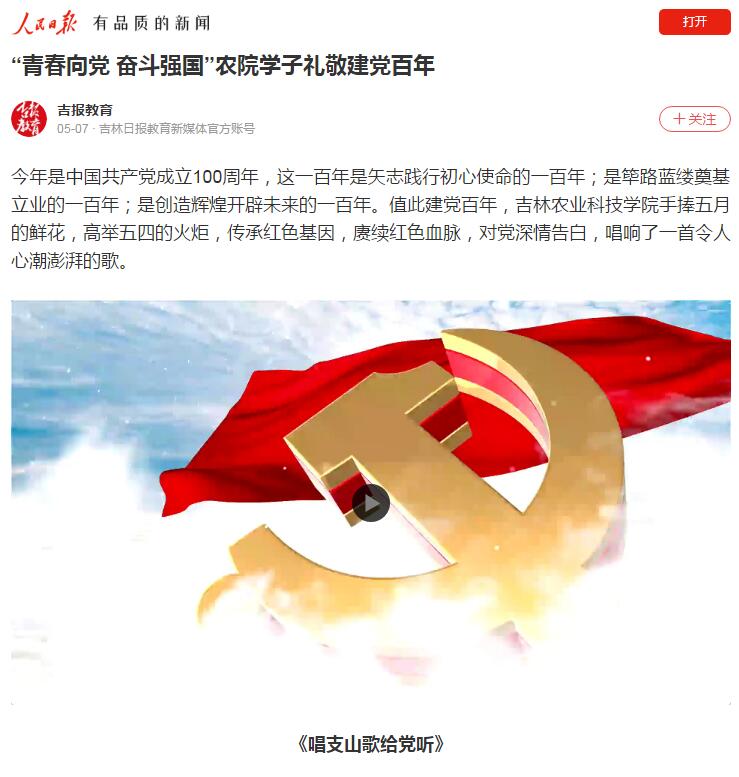 在中国共产党成立100周年之际,吉林农业科技学院全体师生手捧五月的鲜花,高举五四的火炬,传承红色基因,赓续红色血脉,对党深情告白,唱响了一首令人心潮澎湃的歌。农院学子将传承发扬五四精神,积极拥抱新时代、奋进新时代,让青春在为祖国、为人民、为民族、为人类的奉献中焕发出更加绚丽的光彩!