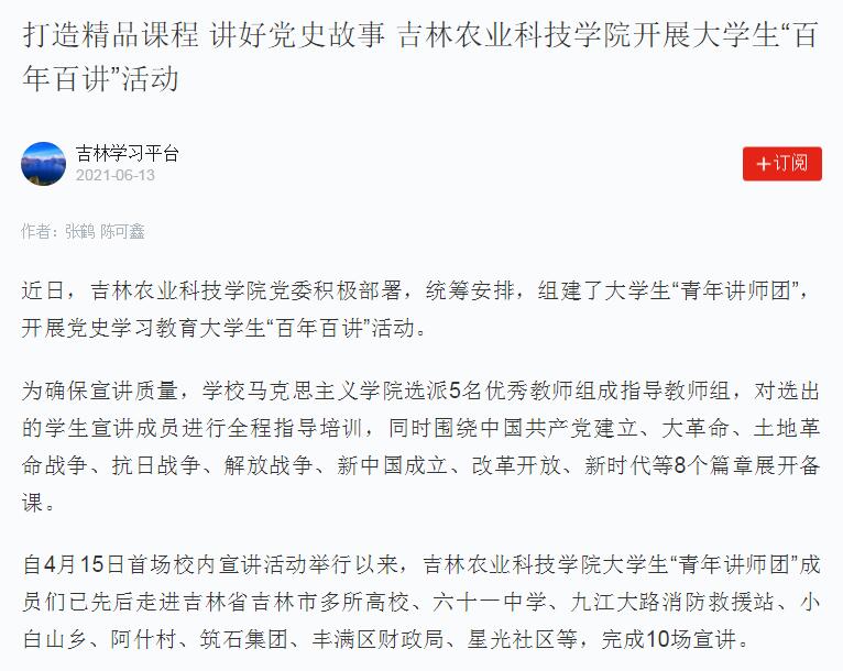 近日,吉林农业科技学院党委积极部署,统筹安排,组建了大学生“青年讲师团”,开展党史学习教育大学生“百年百讲”活动。