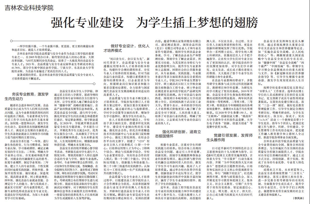 中国教育报近日刊发我校食品工程学院院长李凤林文章《强化专业建设,为学生插上梦想的翅膀》。