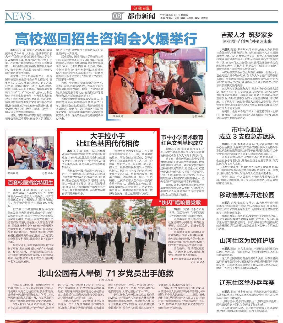 日前,我校图书馆党总支,左家校区觉总支,中药学院党总支及动物科技党总支携手吉林市第六十一中学师生,开展了大手拉小手、让红色基因代代相传系列活动。四个党总支为六十一中捐赠(红岩从钢铁是怎样炼成的从青舂之歌》等红色经典书籍600余册,建立红色经典读水学习园地,并与师生一起进行了导读、诵读、共读等活动,使孩子们在潜移默化中感受到书中主人公敢于拼搏的精神,从而发起勤奋学习的昂扬斗志。活动得到江城日报报道。