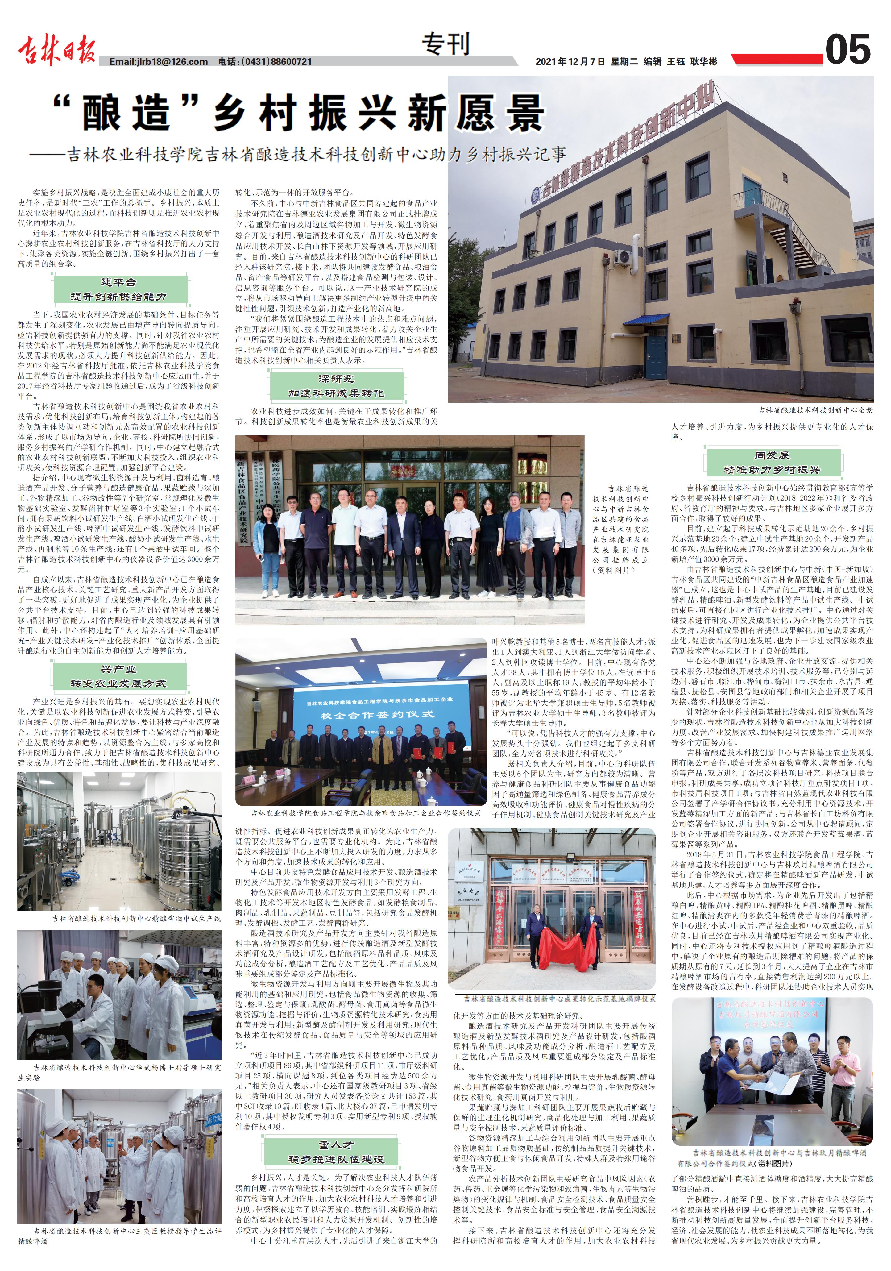 近年来,吉林农业科技学院吉林省酿造技术科技创新中心深耕农业农村科技创新服务,在吉林省科技厅的大力支持下,集聚各类资源,实施全链创新,围绕乡村振兴打出了一套高质量的组合拳。吉林日报围绕吉林省酿造技术科技创新中心作了专题报道。