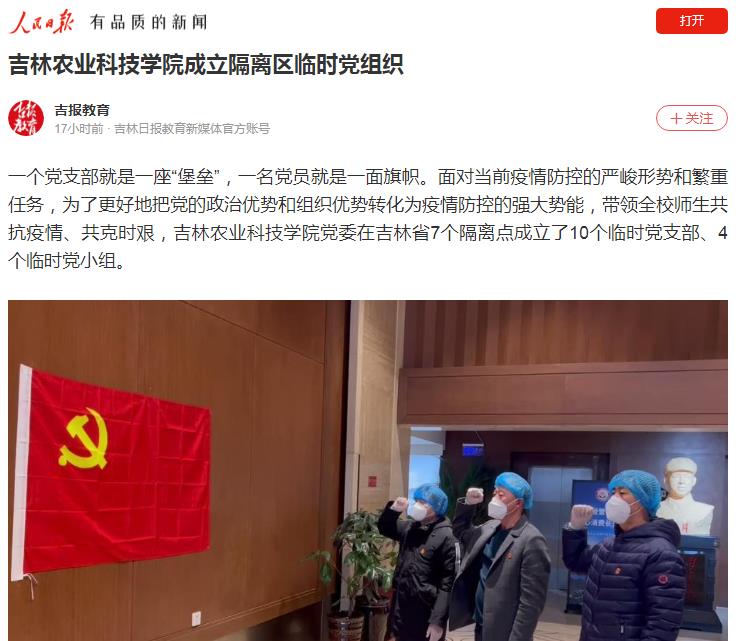 一个党支部就是一座“堡垒”,一名党员就是一面旗帜。面对当前疫情防控的严峻形势和繁重任务,为了更好地把党的政治优势和组织优势转化为疫情防控的强大势能,带领全校师生共抗疫情、共克时艰,吉林农业科技学院党委在吉林省7个隔离点成立了10个临时党支部、4个临时党小组。