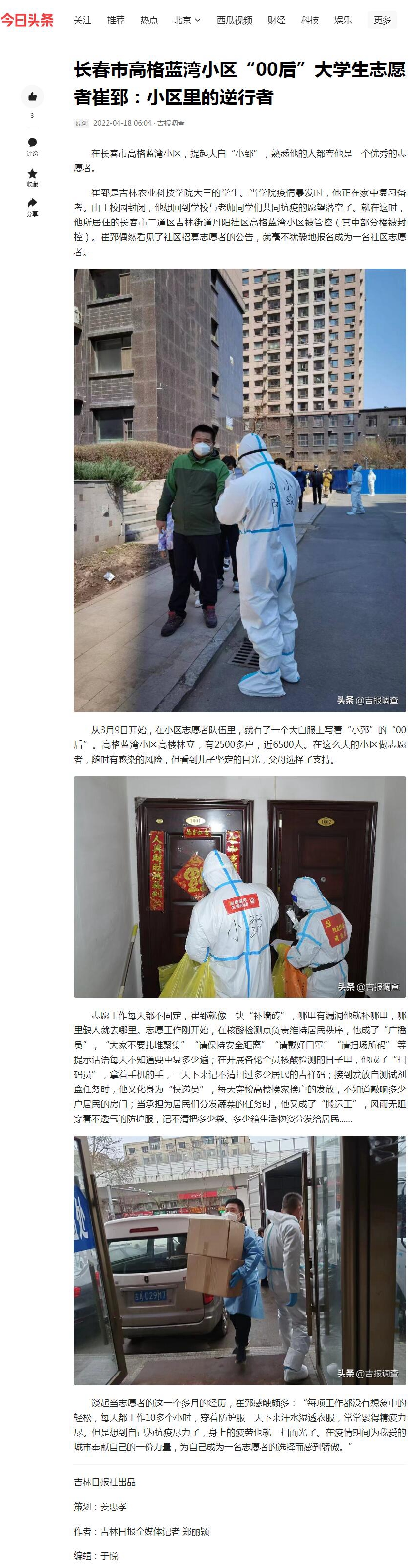 吉林农业科技学院大三学生崔郅在所住小区报名担当社区志愿者,志愿事迹被今日头条·吉报调查频道报道。