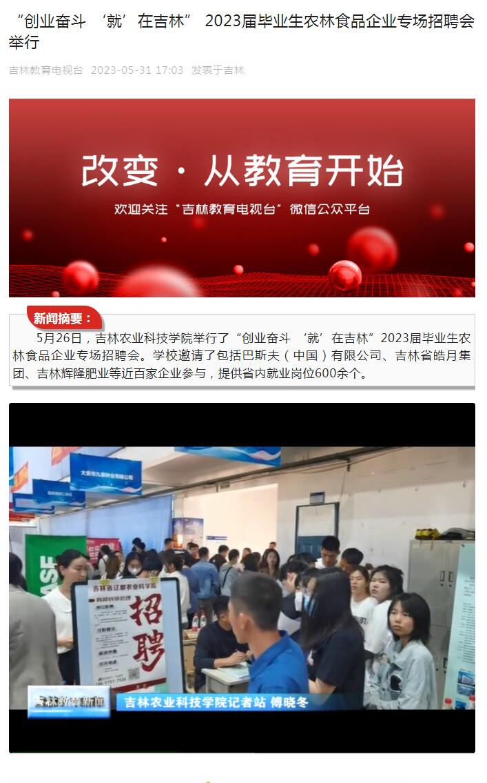 5月26日,吉林农业科技学院举行了“创业奋斗 ‘就’在吉林”2023届毕业生农林食品企业专场招聘会。学校邀请了包括巴斯夫(中国)有限公司、吉林省皓月集团、吉林辉隆肥业等近百家企业参与,提供省内就业岗位600余个。