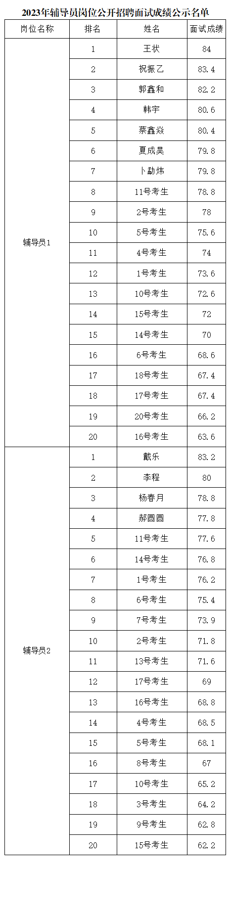 2023年辅导员岗位公开招聘面试成绩公示名单