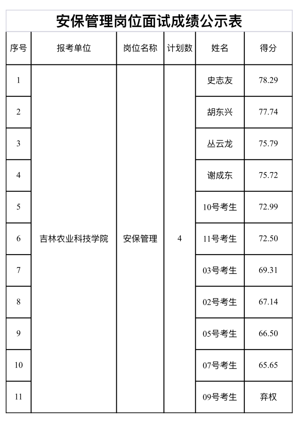 吉林农业科技学院安保管理岗位面试考生成绩公示